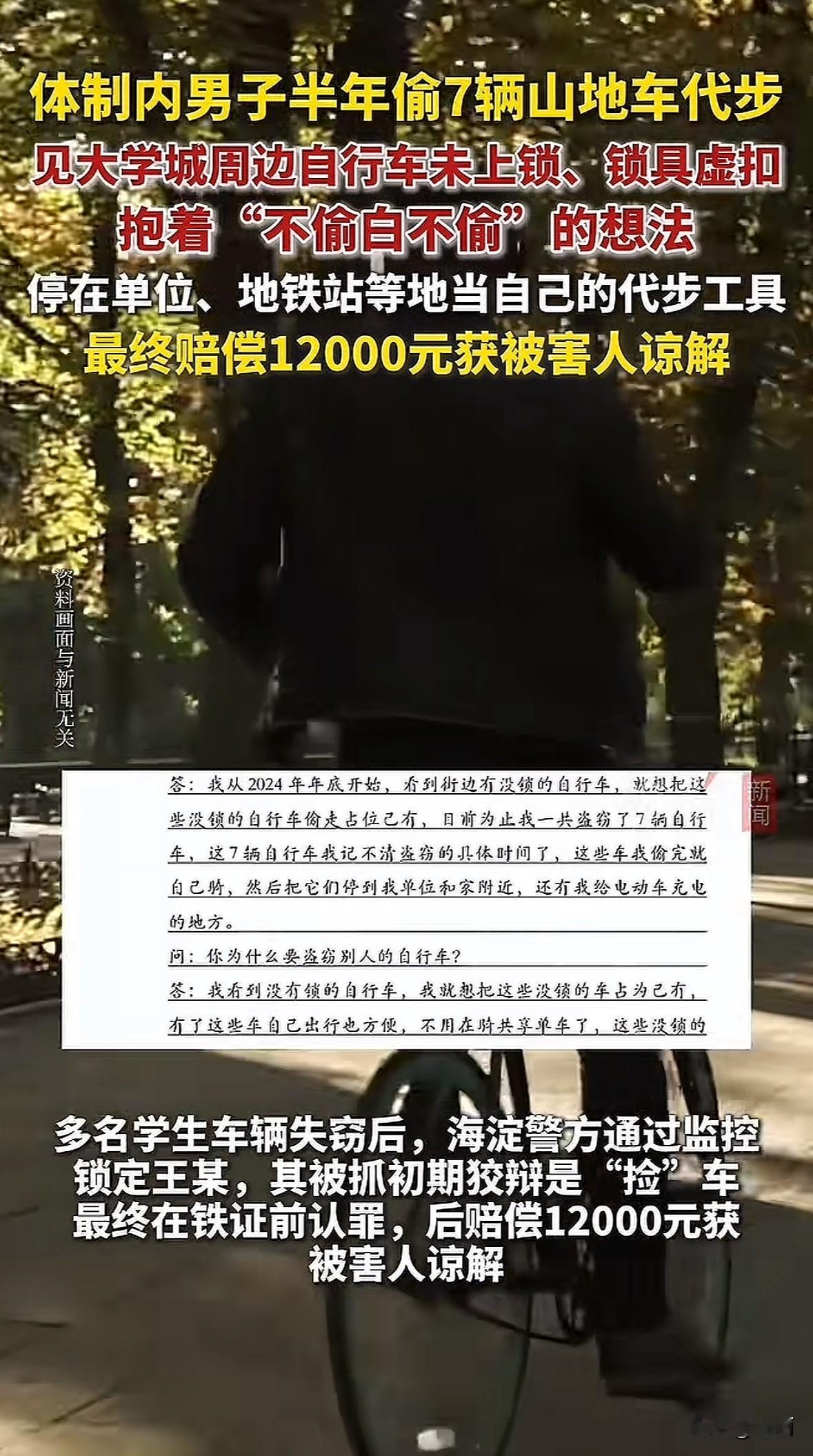 50多岁的体制内男子王某,家庭条件优越,半年内却在海淀大学城周边偷了7辆山地自行车。这些车多是学生没锁好的,他偷来当代步工具,停在单位、地铁站等地。被抓后他还狡辩是“捡”的,铁证面前才认罪,之后赔偿12000元获得部分被害人谅解。 这事挺让人唏嘘,体面工作和优渥生活换不来守法意识。不是缺钱却偷东西,还越偷越上瘾,本质是贪小便宜没底线。法律不管作案动机,多次盗窃或数额达标就构成犯罪。不管身份多体面,都不能触碰法律红线。做人得守住底线,莫因一时侥幸留下人生污点,得不偿失。