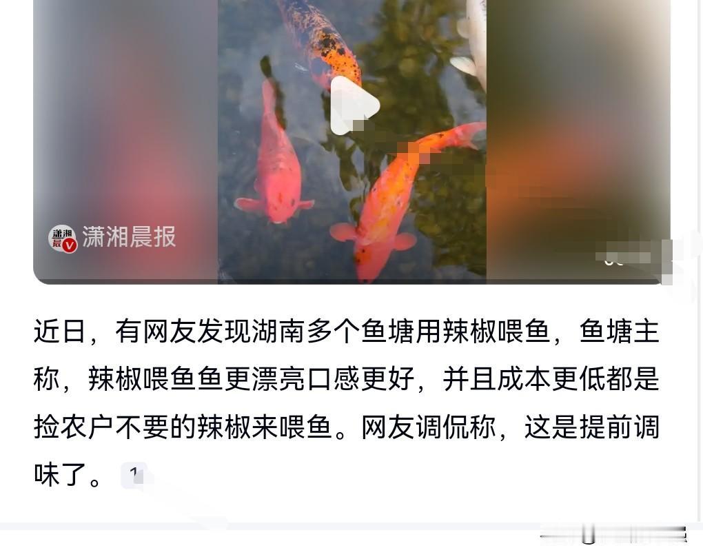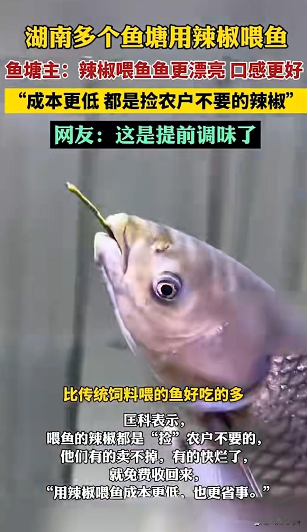 如果不是在网上亲眼所见,我是万万不敢相信,竟然有人用辣椒喂鱼。 11月7日在网上看到这么一个奇葩事,湖南多个鱼塘用辣椒喂鱼。 鱼难道也好这一口?还能吃辣,的确实超出我的认知啊。 这下上热搜了,估计全国的鱼塘主们要开始模仿了。 有的辣椒卖不掉,这说明湖南的辣椒产量有点多啊。 免费收回来,这真是能省很多的饲料钱啊,那能赚不少。