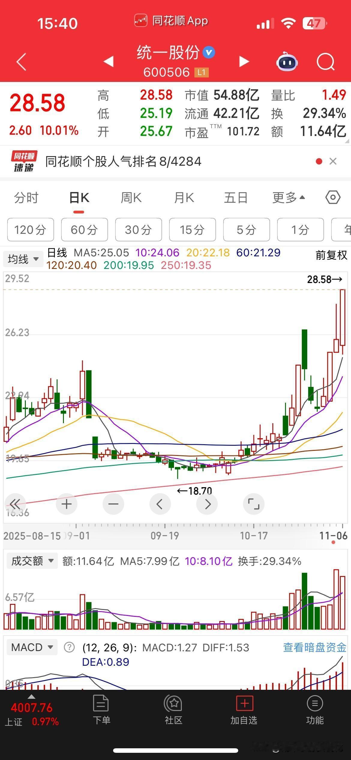 统一股份:靠名字躺赢“台湾回归”概念? “不排除武力统一”七个字一出,A股连夜加班找“旗手”。刀枪未动,资金先冲——地图炒完炒港口,港口炒完炒“名字”。于是,统一股份横空出世:代码一响,自带BGM,仿佛台湾回归第二天就能改名“统一完成”。 游资逻辑简单粗暴:谁管你主营润滑油?要的就是“精神代码”。同理,若明天蹦出“两岸一家”“中华一统”公司,照样涨停给你看。 我却觉得,短线赌情绪无可厚非,长线还得看桶油卖几斤。名字再好,也抵不过业绩报表的“地心引力”。政策窗口期一旦拉长,概念褪色,裸泳的还是PE。 所以,统一股份到底真统一还是纯碰瓷?键盘给你,留言说说:如果盘后真的冒出一家“两岸一家”公司,你追不追?