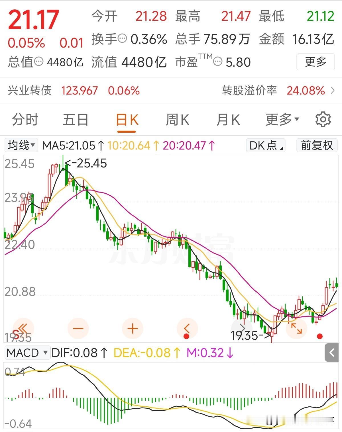 今天最高上冲到21.47元,连续四天冲高再回落收个小十字星! 基本面方面,兴业银行高于5%股息率我大部分仓位不会太多参考技术指标,选择当鸵鸟! 技术面上已经连续5日在20日均线上方,下方MACD也冲到0轴以上了!至于短期21.5阻力,无非需要上下折腾下,相信终究会冲过去!