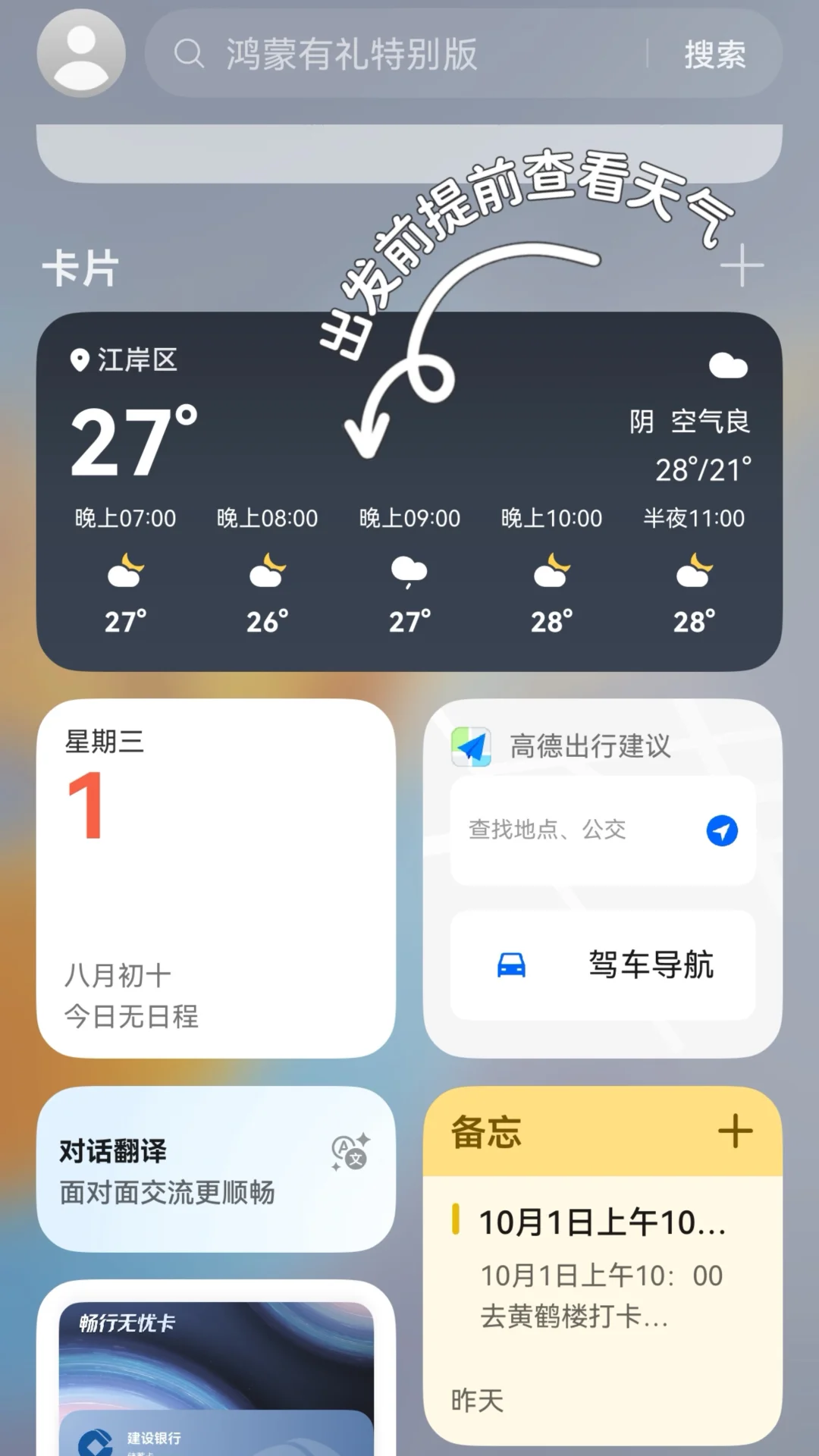 1.出门前用华为鸿蒙5负一屏观察天气状况,国庆武汉早晚凉,带件薄外套