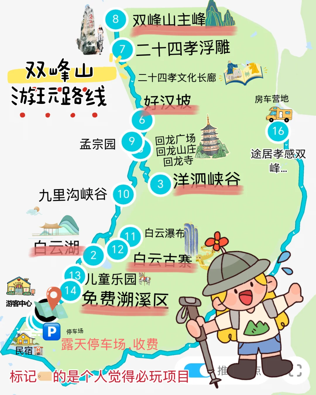 入园➡️白云湖→洋泗峡谷→回龙山庄→回龙寺→好汉坡→二十四孝长廊→双峰主峰→孟宗园→望夫亭→九里沟→徒步栈道→白云水库→白云古寨→孝文化长廊→门口溯溪→出口