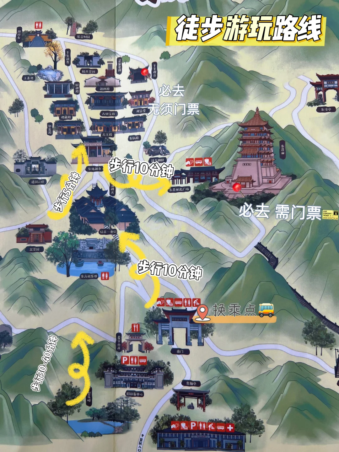 游客中心→乘景交→枫香步道(1km/20min)→弘化禅寺(停 30min)→银杏广场→东昌阁(停 40min)→仿古街(停 30min)→乘景交返程
