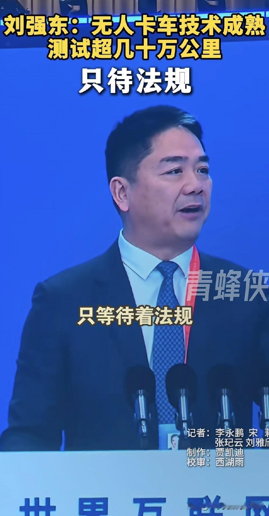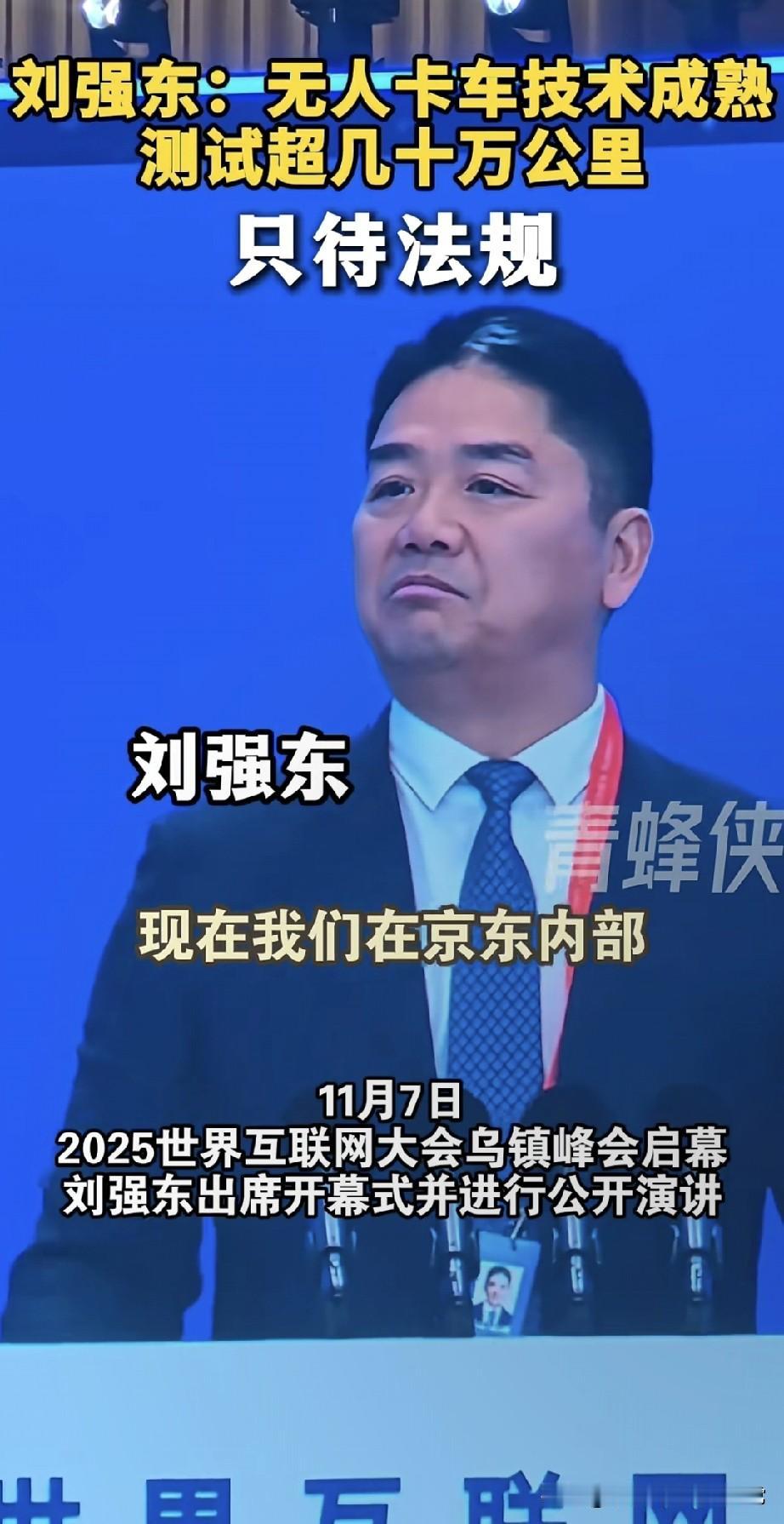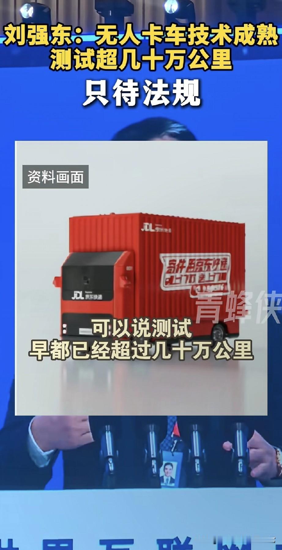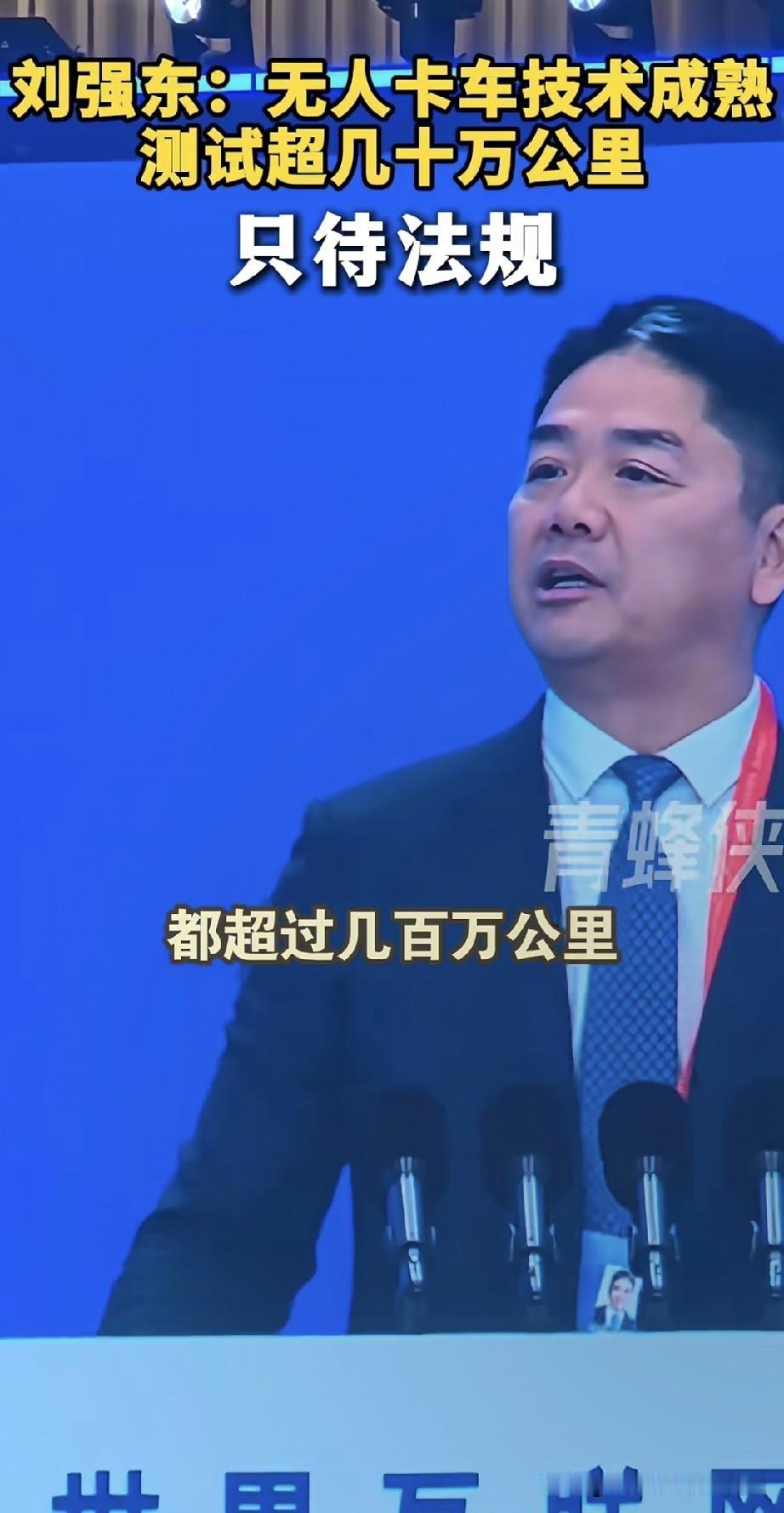 刘强东放话:京东无人卡车来了,就等法规“开绿灯”! 乌镇互联网大会上,刘强东一句话炸了:京东无人卡车技术早成熟了,内部测试都跑了几百万公里,现在就卡在法规这道坎儿上。 这事儿直接戳中网友神经:一边喊“以后快递更便宜更快了”,一边慌“卡车司机是不是要失业了?” 有人算过账:无人卡车能连轴转,运费能砍一半;但也有人怼:“法规没跟上,出了事算谁的?” 现在技术跑在规则前面,到底是该催法规赶紧松口,还是该慢下来把风险堵死?你们觉得,无人卡车大规模上路,是福是祸