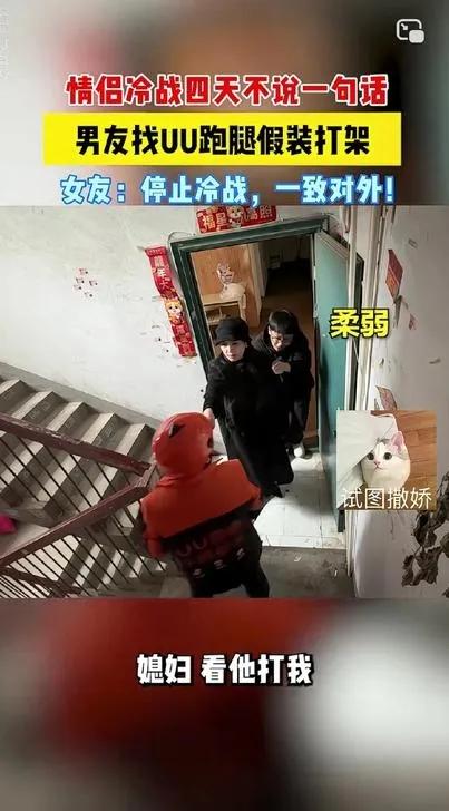 河南,女子刚上楼,一男子就委屈地对她说:“媳妇,他打我。”女子一把拉开外卖小哥,霸气地问:“你谁啊,你干嘛打人!” 外卖小哥不示弱,嘴巴一下没闲着,对着这对情侣就是一顿输出。女子急了,说:“我投诉你。”男子躲在媳妇背后,连忙对下楼的外卖小哥说:“没事,没事,我不投诉你。” 女子做梦也想不到,这是男子找来的托。原来两个人是一对情侣,因为琐事冷战了4天。男子着急,嘴里喊着媳妇,女子却一点不退让。整天板着脸,不和男子说话。男子又难过又着急,心想,老这么下去多憋得慌,日子过得磕磕绊绊,太累了。不行,得想个办法打破僵局。于是心生一计,下单了一位外卖小哥,陪他演场戏。 外卖小哥接到单后,到现场和男子了解情况。两人坐在楼梯间,外卖小哥先把男子教训了一顿:“吵架避免不了,过日子谁不吵架,你低个头不就完了。”男子说:“三四天都没和我说话了,我也是没办法才找你。一会等她回来了,你伸手适当打我两下......。” 两人正编排剧本,楼梯间忽然响起脚步声。“来了,来了”,两人赶紧站起来,摆开吵架的架势。 “哎,你送外卖送晚了,还骂人!”男子一秒入戏。 “不能怪我啊。”外卖小哥叫屈。 两人你一言我一语地掰持,女子已上了楼。外卖小哥按剧本情节拍了男子两下,正好被女子看到,上前一把拉开外卖小哥,问:“你谁啊。” 男子立刻装出柔弱又委屈的样子,说:“媳妇,你看他打我。” “你干嘛打我老公。”女子一看男子被打,心疼得不行,早忘了两人之间的矛盾。 外卖小哥反问女子:“你谁啊。” 女子霸气回答:“我是他老婆,” 好,找的就是你。外卖小哥对着小两口一顿输出,女子气得七窍生烟,转身安慰男子:“我投诉他,你没事啊。” 男子和外卖小哥一看计划得逞,赶紧偃旗息鼓。男子哄女子进家,说:“媳妇,没事,别生气了,这种人就没素质,咱们晚上吃啥呀。”顺手把门关上。外卖小哥也趁机溜了。 果然,聪明的男人永远不会单身。轻松一招,找个外敌,化解了内部矛盾。 男子汉,大丈夫,能屈能伸。为了挽回老婆的芳心,不惜装弱,装委屈。 女子也是真心过日子的人,虽然生气使了使小性子,但看到老公被外人“欺负”,立刻挺身而出,挡在男人面前,为老公出气,还安慰老公,没事,有我呢。 男子看到老婆这个样子,心里乐开了花。老婆那是真护犊子,我老公只能我欺负,外人坚决不能。三四天的冷战一下子消解了。 这里也得感谢外卖小哥,不仅劝男子好好过日子,还配合男子演戏,只为促成两人和好,差点搭上自己的职业素养。外卖小哥太不容易了。 也有人说,妻子其实知道是苦肉计,她只是借坡下驴而已。 不管怎样,男子用自己的智慧维护了婚姻,女子也愿意化解矛盾,和好如初,真正是夫妻同心。 真甜! 资料:拜托了师傅