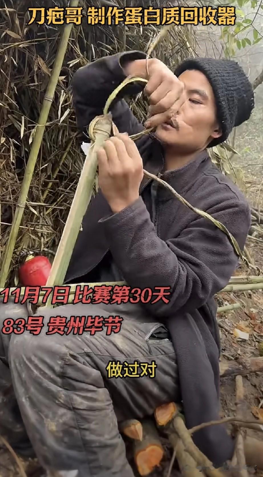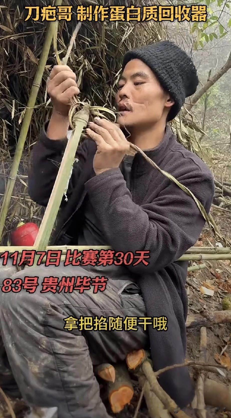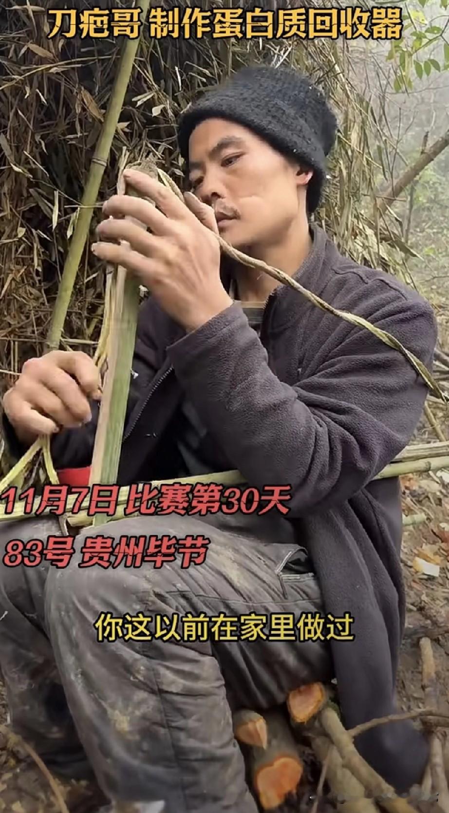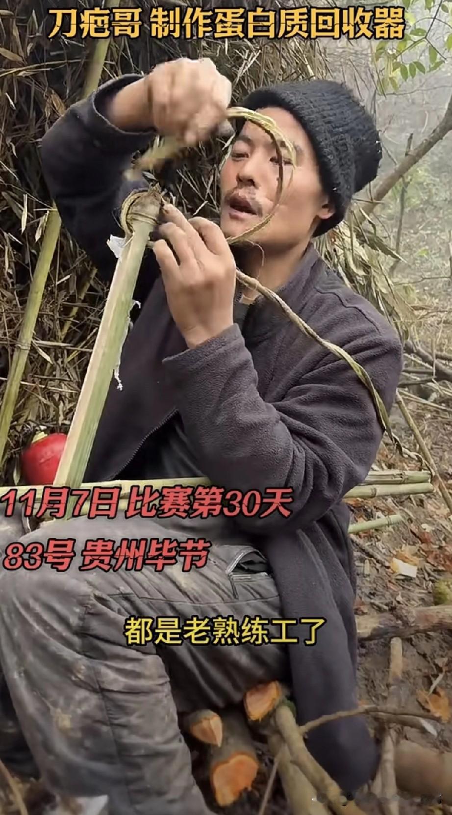 荒野求生“刀疤哥”这手活儿,城里人看傻了 张家界七星山的野林里,83号贵州毕节的“刀疤哥”蹲在泥地里,薅着竹子咔咔编东西——这叫“蛋白质回收器”,说白了就是抓野货的陷阱。 看他那手法,手指绕着竹条翻飞,嘴里还念叨“老熟练工了”,敢情这是在家练过的真本事!黑乎乎的外套沾着泥,帽子压得低,但编陷阱的劲儿特稳,旁边堆的竹料都快比人高了。 网友说他“看着凶,实则暖”,但我瞅着这熟练劲儿犯嘀咕:这陷阱要是真逮着东西,算野外生存技能,还是算“开挂”?毕竟咱城里人连个绳结都打不利索,他这手活儿,到底算天赋还是提前练过的“野路子”?