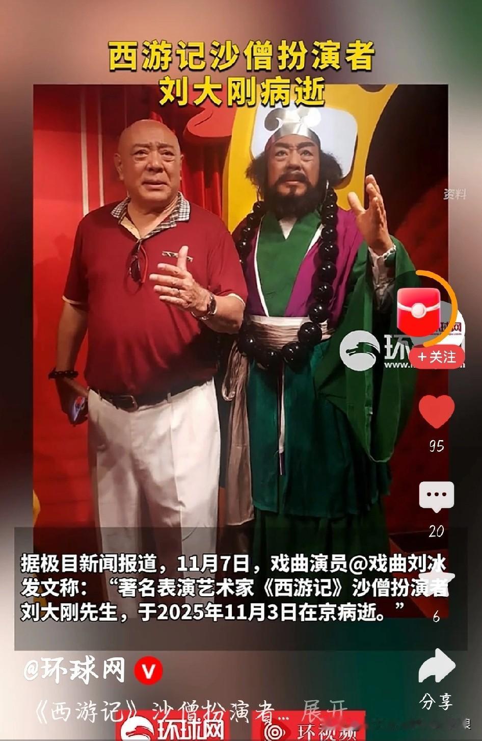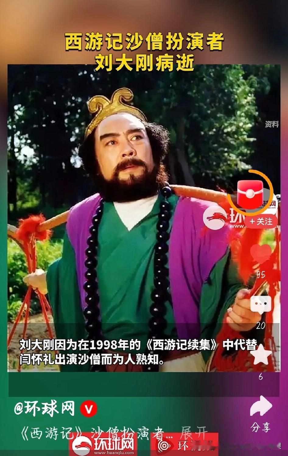 刚刷到“沙僧”扮演者刘大刚老师去世的消息,心里一下就沉了,享年78岁,太让人惋惜了! 我小时候看《西游记续集》,就觉得他演的沙僧特别地道,蓝靛脸、挑着担子,忠厚老实的样子,和师父师兄们搭戏特别合拍。后来才知道,他是京剧出身,为了演好角色,每天扛着好几公斤的道具,受伤了也坚持拍戏,这份敬业真让人佩服。 戏里他是任劳任怨的沙僧,戏外是热心肠的好人,六小龄童都夸他憨厚。现在两代沙僧都走了,《西游记》的回忆又少了一块。 感谢刘大刚老师把经典角色留在荧幕上,陪伴了我们整个童年。愿老先生一路走好,天堂也有取经路!你们对他演的沙僧印象最深的是哪个片段? 要不要我帮你整理刘大刚老师的经典影视片段合集,配上怀念文案?“沙僧”扮演者刘大刚去世 沙僧假发 刘大刚 西游记 西游记续集 图片截图于环球网