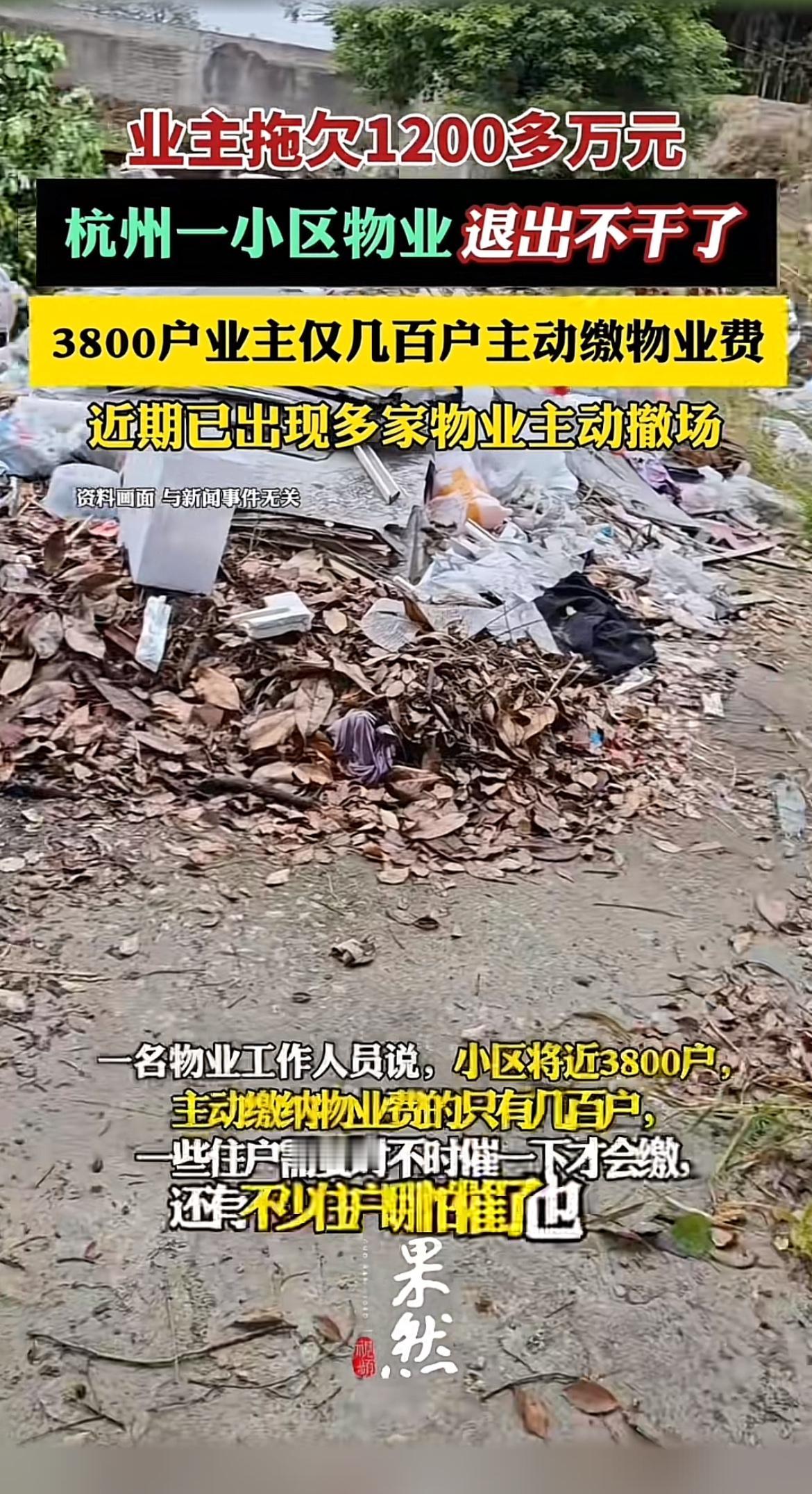 杭州这小区物业的事儿太闹心了。将近3800户业主,就几百户主动缴费,累计欠费达1200多万,物业直接发退出告知函,2025年底要撤场。 这事儿其实也不能全怪业主。2021年换的新物业,刚来时治理中心湖,口碑那叫一个好。但两年不到,小区服务直线下滑。保洁偷懒,楼道清扫不及时,垃圾乱堆;绿化没人管,杂草丛生;地下车库更是混乱,车位乱占,消防通道都堵死。报修也没下文,张阿姨阳台漏水报三次都没人处理。 物业服务不好,业主自然不想缴费。这僵局得双方都做出改变,不然最后苦的还是小区里的居民。