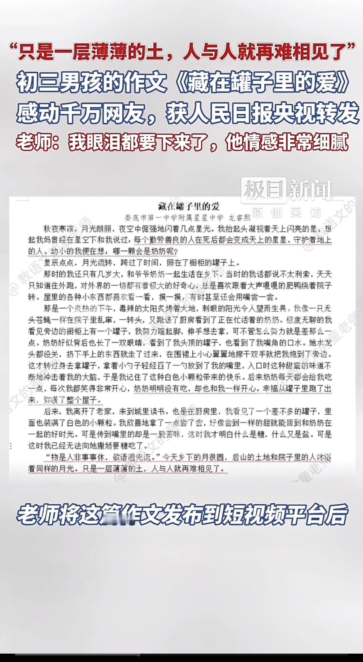 最近看到一篇叫“藏罐子里的爱”的作文,真是把网友们感动坏了。作文里,孩子把对家人的爱藏进一个个小罐子。比如,有个罐子代表帮妈妈洗碗的爱,孩子想着通过劳动让妈妈轻松点;还有个罐子装着陪爷爷下棋的爱,在棋盘上感受爷孙间的温暖。这些小罐子看似普通,却装满了孩子纯真又深厚的情感。它让我们看到,爱不一定是惊天动地的大事,生活里的点滴小事,那些用心付出的瞬间,就是最珍贵的爱,也难怪能感动这么多人。