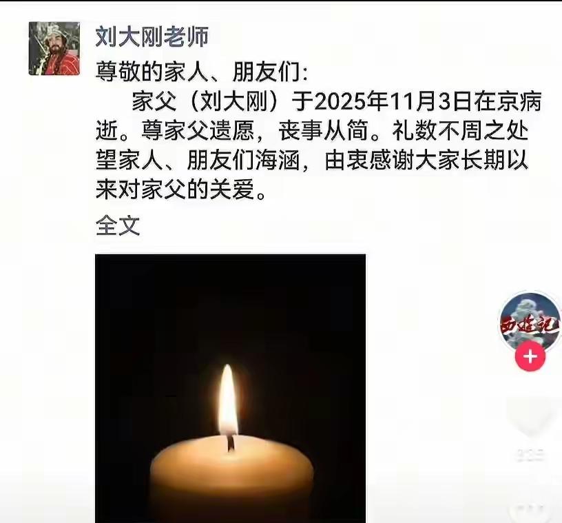 刘大刚老师去世了。 这件事里,最难过、最受触动的,或许不是观众,也不是剧组,而是我们这些看着《西游记》长大的普通人。 小时候守在电视机前,看的是86版闫怀礼老师演的沙僧,后来续集播出,跟着刘大刚老师版的沙僧继续走。 如今,两位“沙僧”都走了,就好像童年里那个默默挑着担子的人,真的回天庭去了心里空落落的,说不出的难受。 还记得闫怀礼老师曾一人分饰十多个角色,刘大刚老师挑着二十多公斤的担子一拍就是一年半。 如今再想起这些画面,眼眶突然就湿了。原来经典,早已悄悄融入我们的生活里。 他们用一辈子,演活了一个角色;我们用一辈子,记住了他们。 这算不算是另一种意义上的“取经成功”?