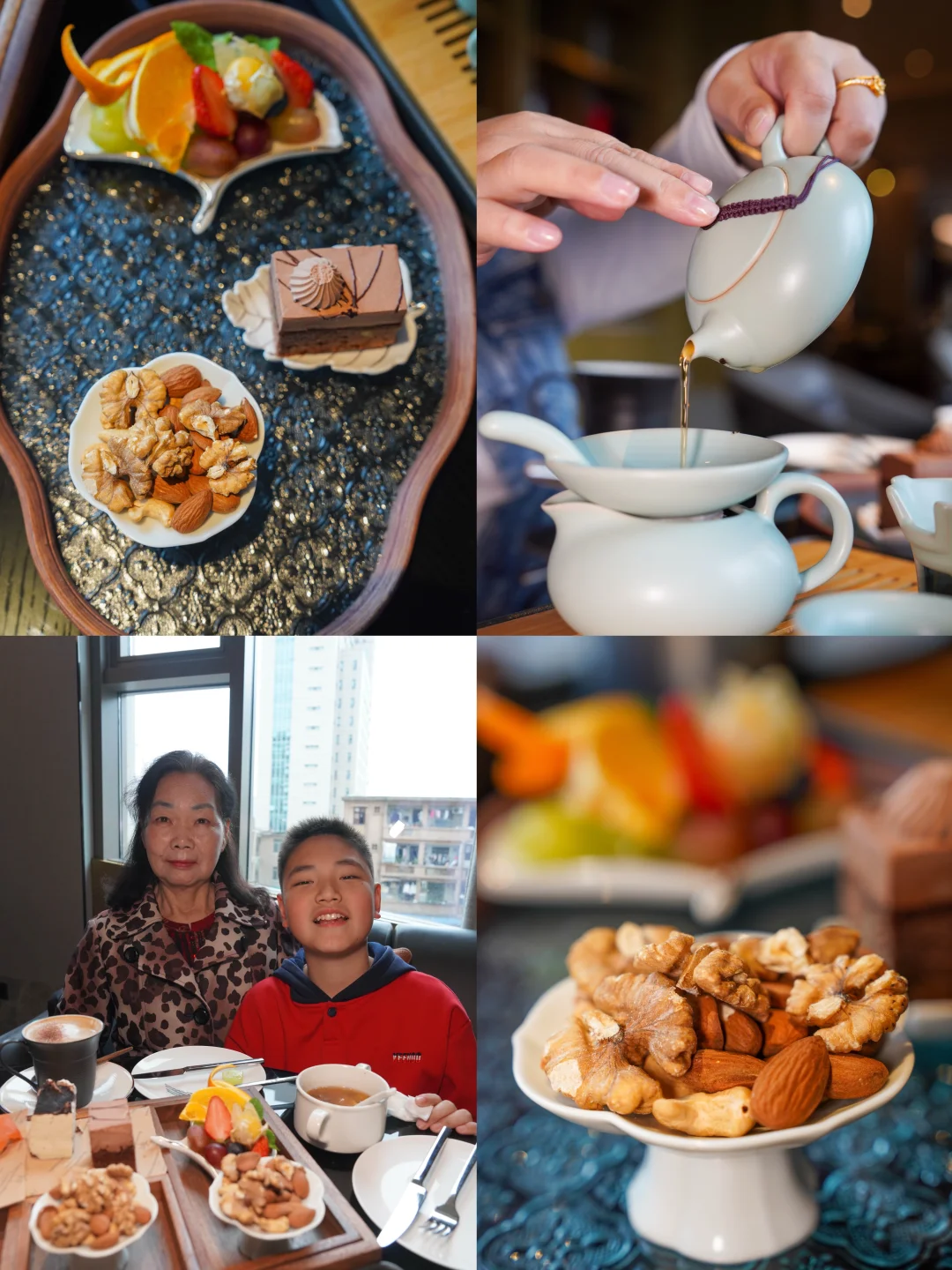 🥤下午茶:双人下午茶,配有水果和蛋糕,蛋糕甜度适中,水果口感清爽,配上伯爵茶,健康又解腻~