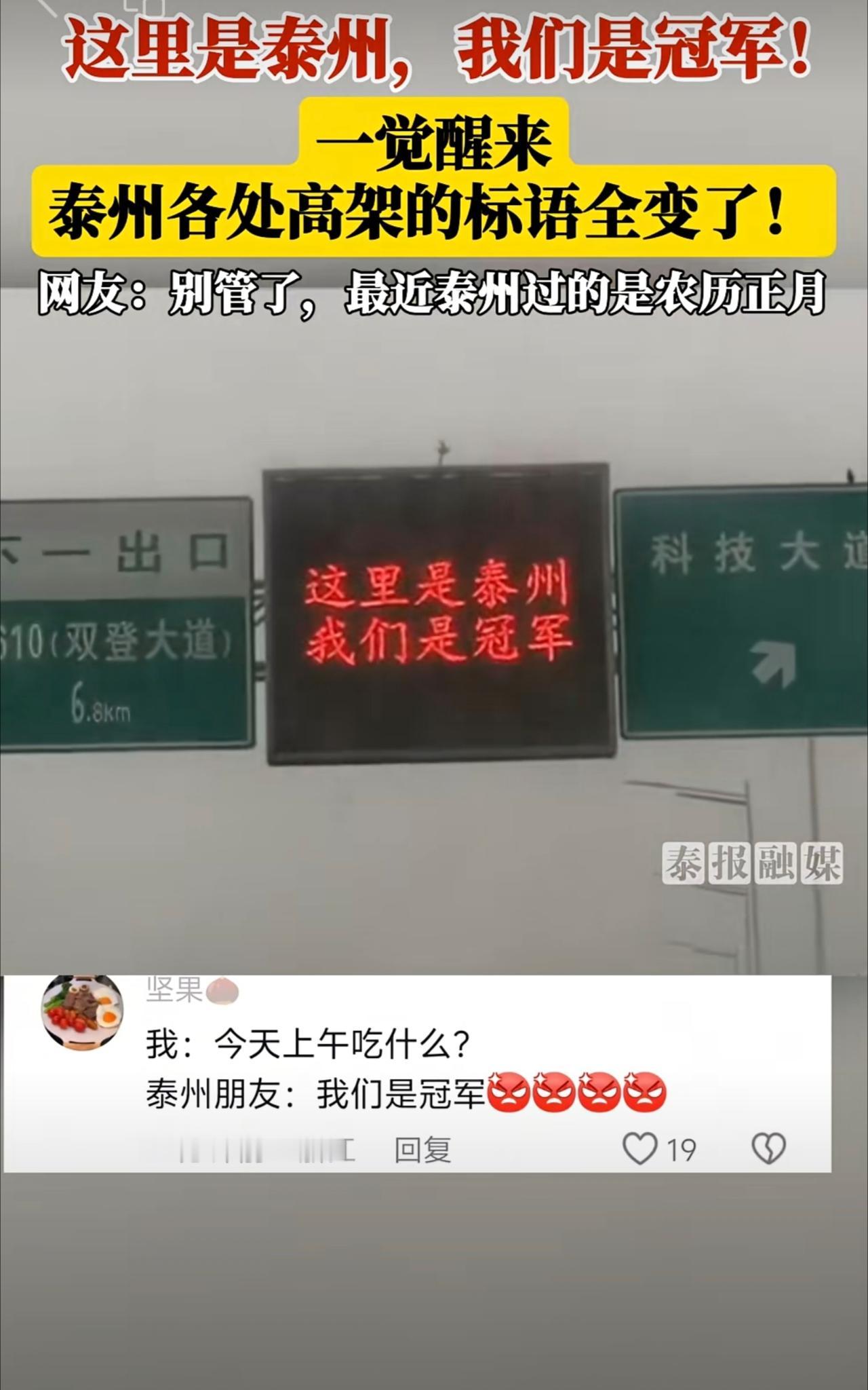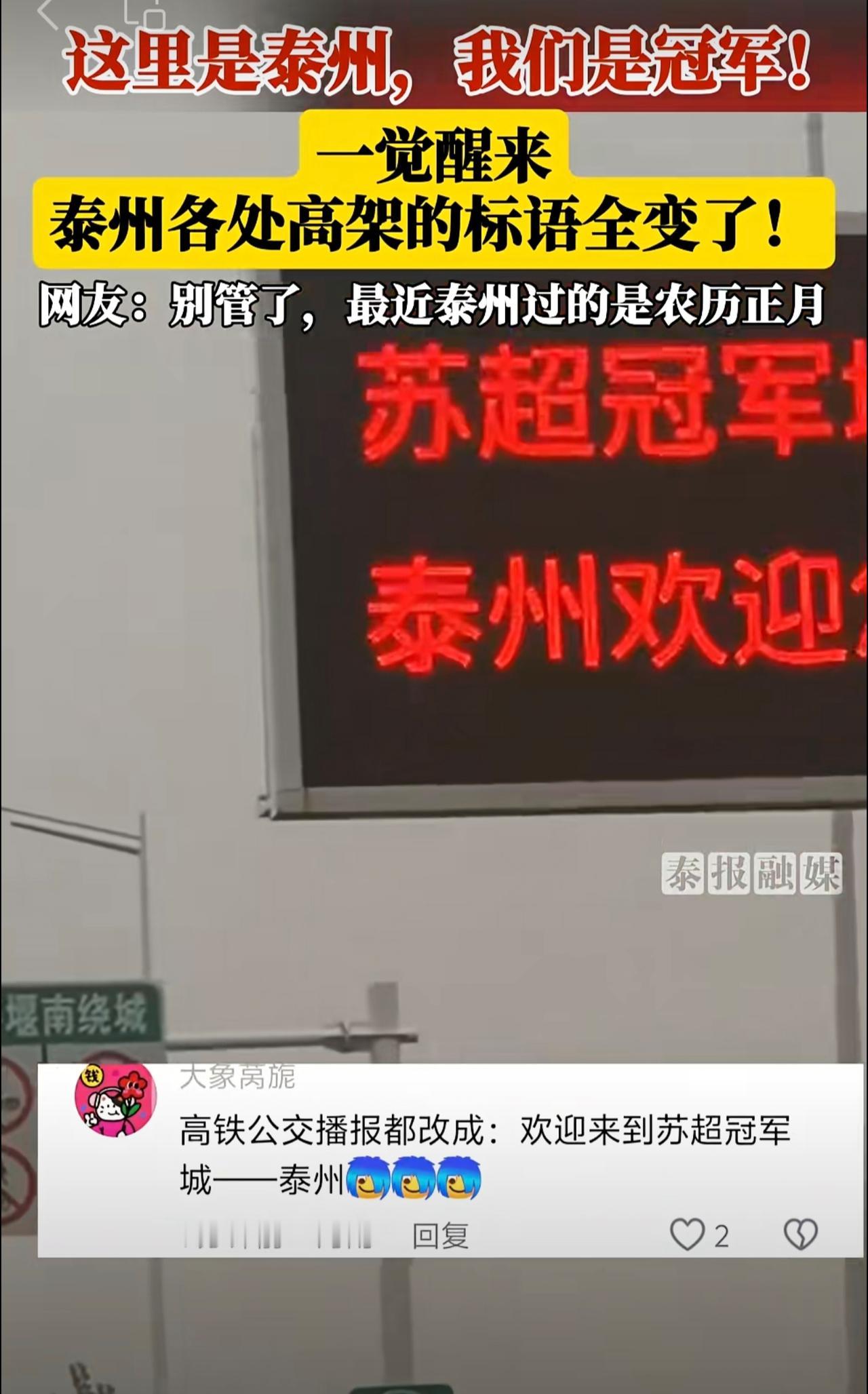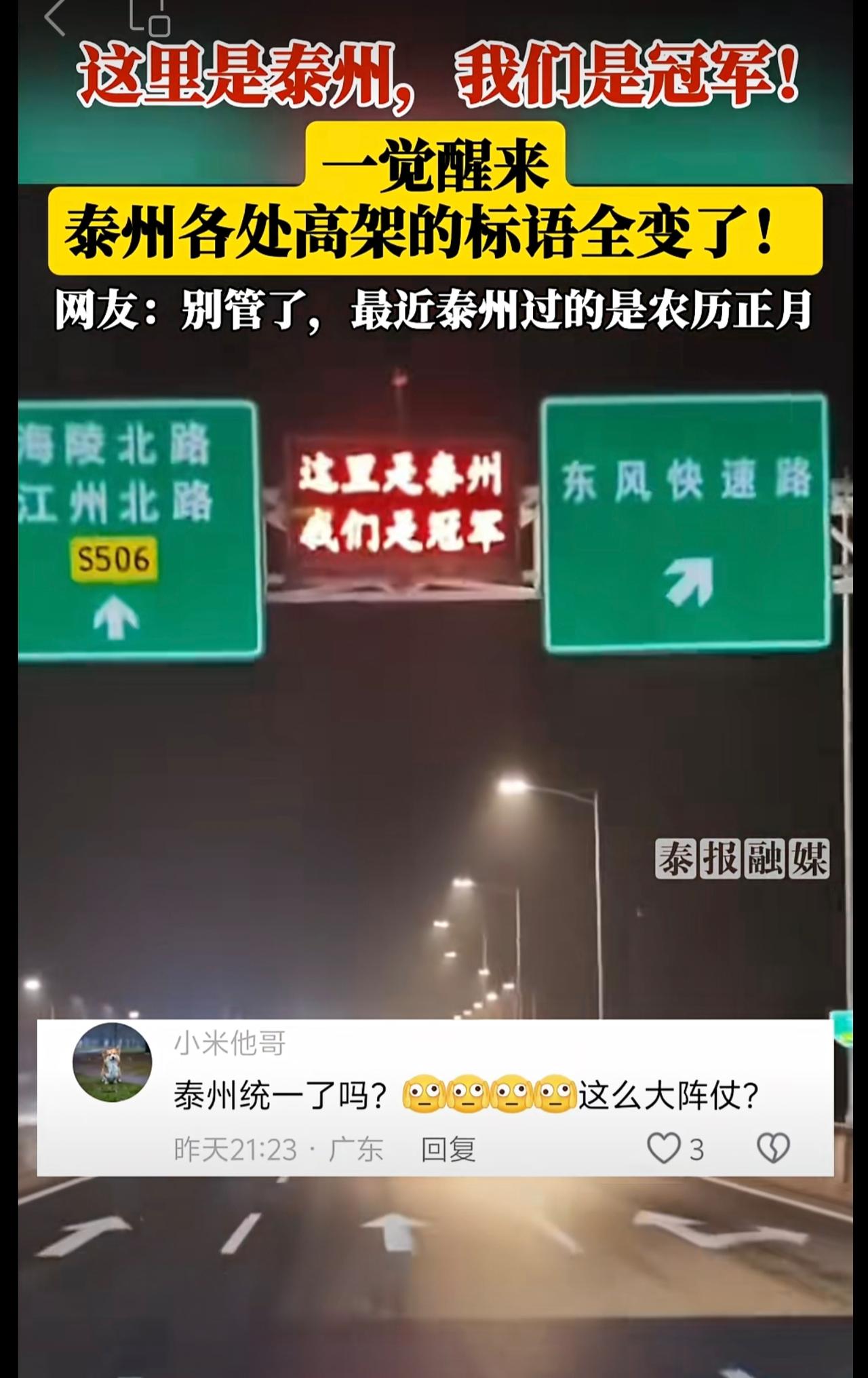 这里是泰州,我们是冠军!一觉醒来,泰州各处高架的标语全变了!你拍到了吗?泰州 江苏 泰州冠军 苏超 (素材来源:还在过年的泰州市民们) 制作:李雨欣 初审:李益君 复审:卢仲云 终审:刘保华
