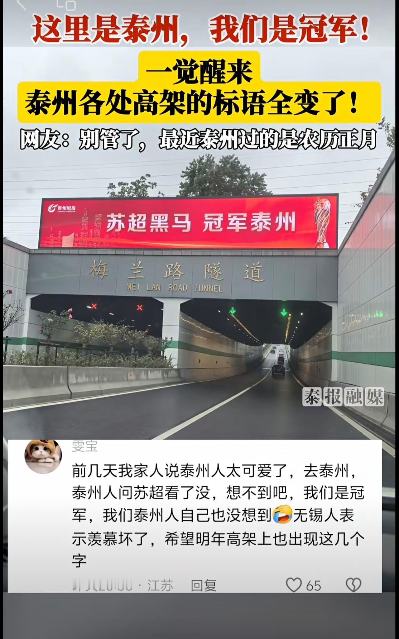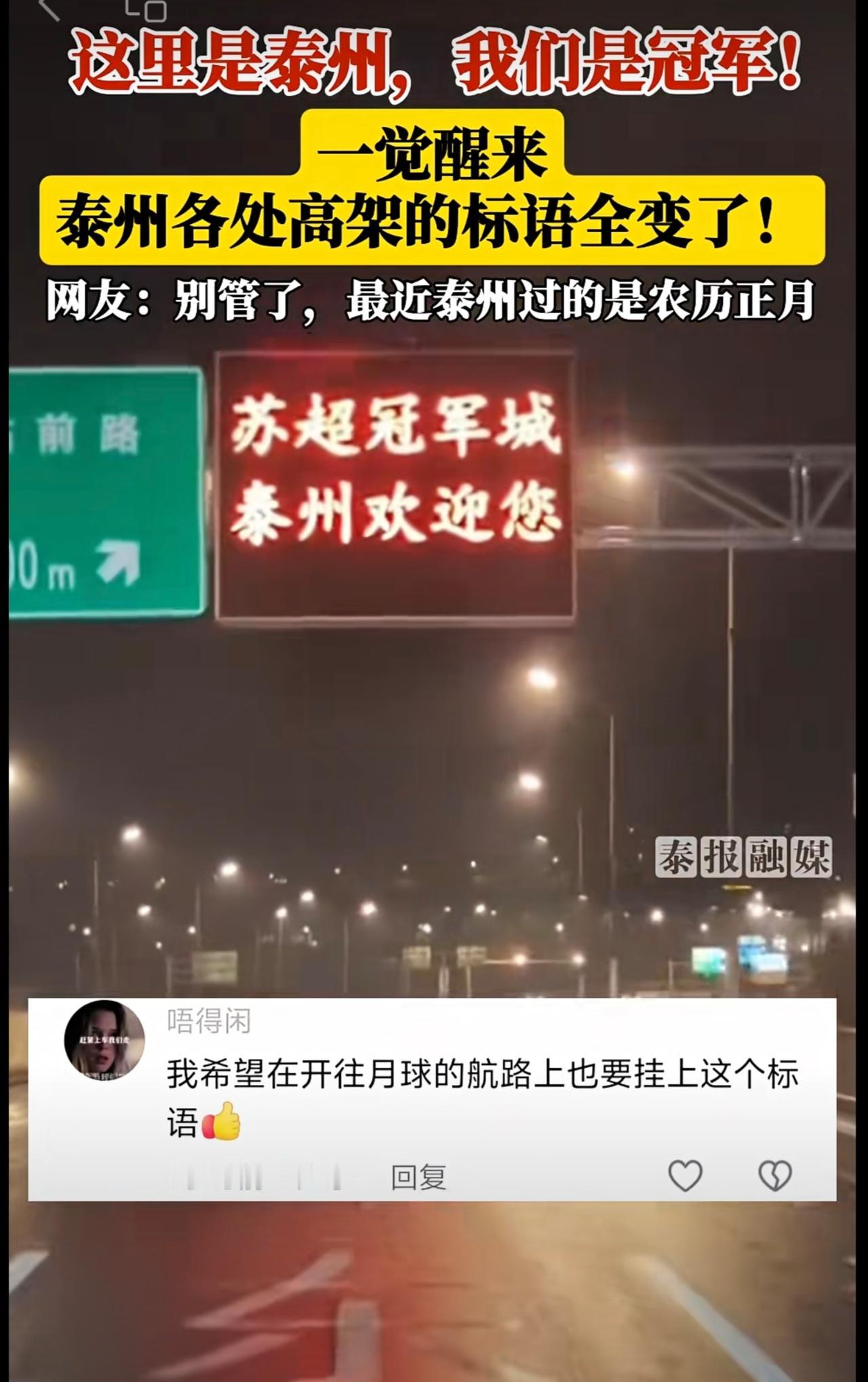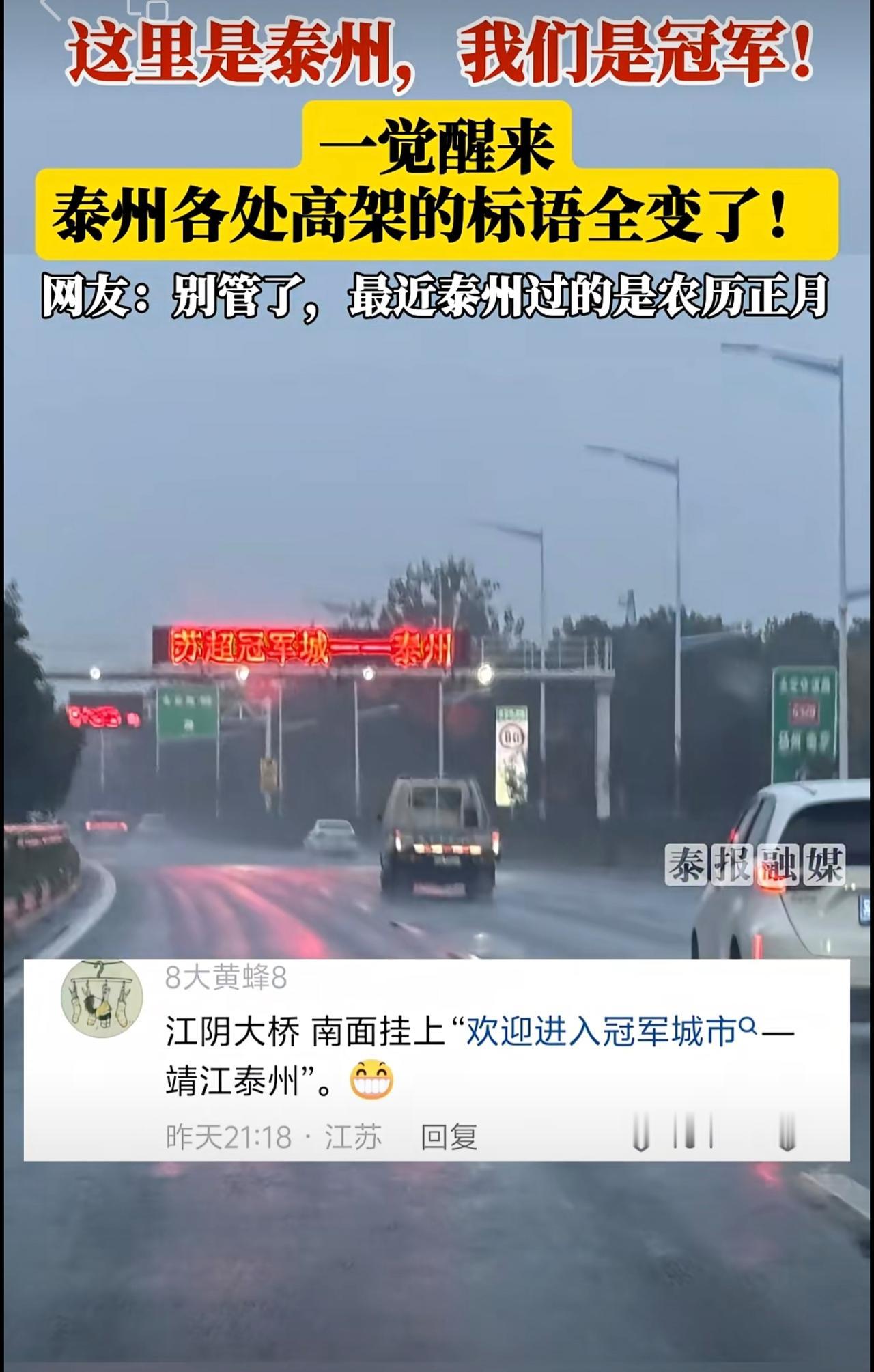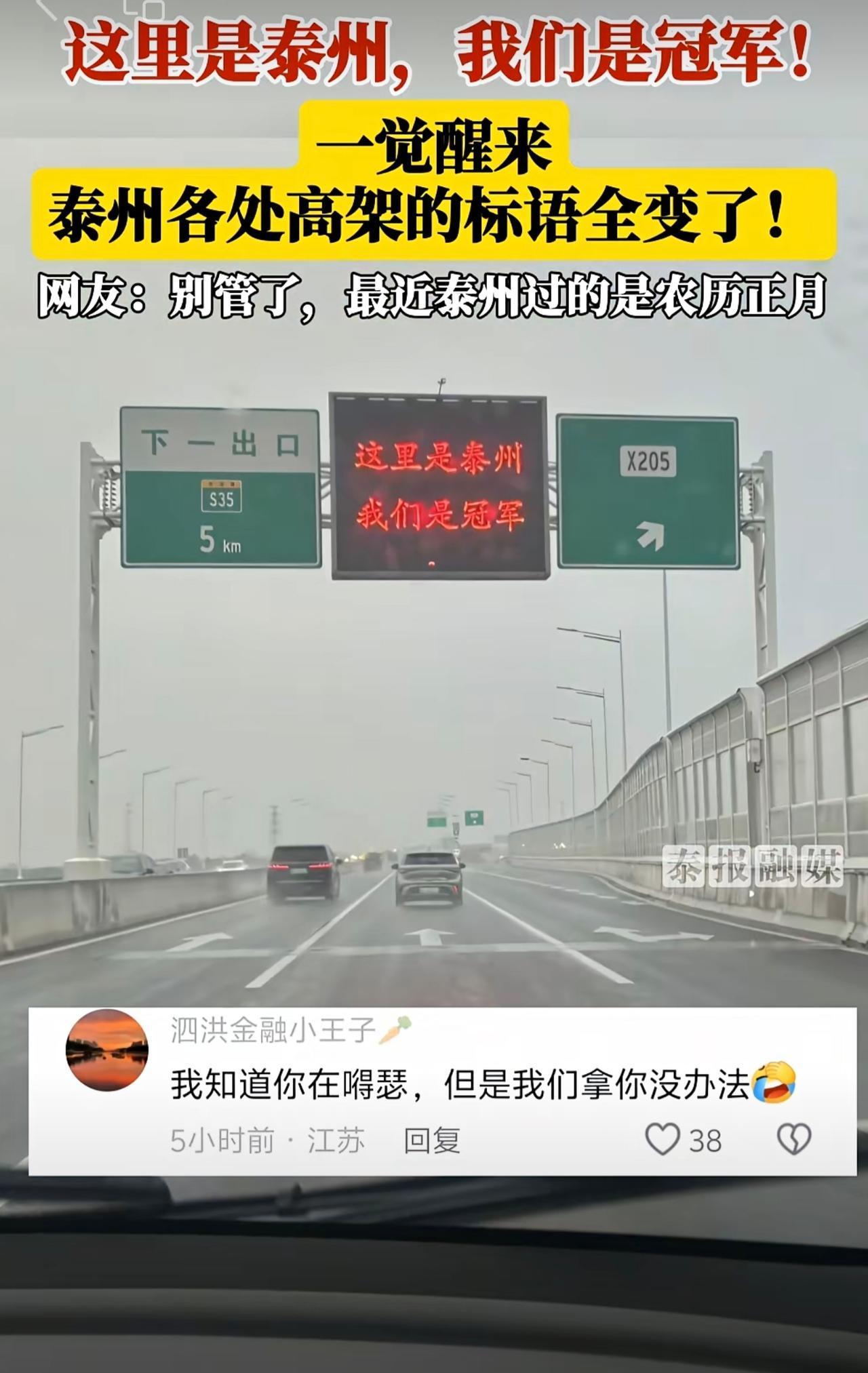 这里是泰州,我们是冠军!一觉醒来,泰州各处高架的标语全变了!你拍到了吗?泰州 江苏 泰州冠军 苏超 (素材来源:还在过年的泰州市民们) 制作:李雨欣 初审:李益君 复审:卢仲云 终审:刘保华