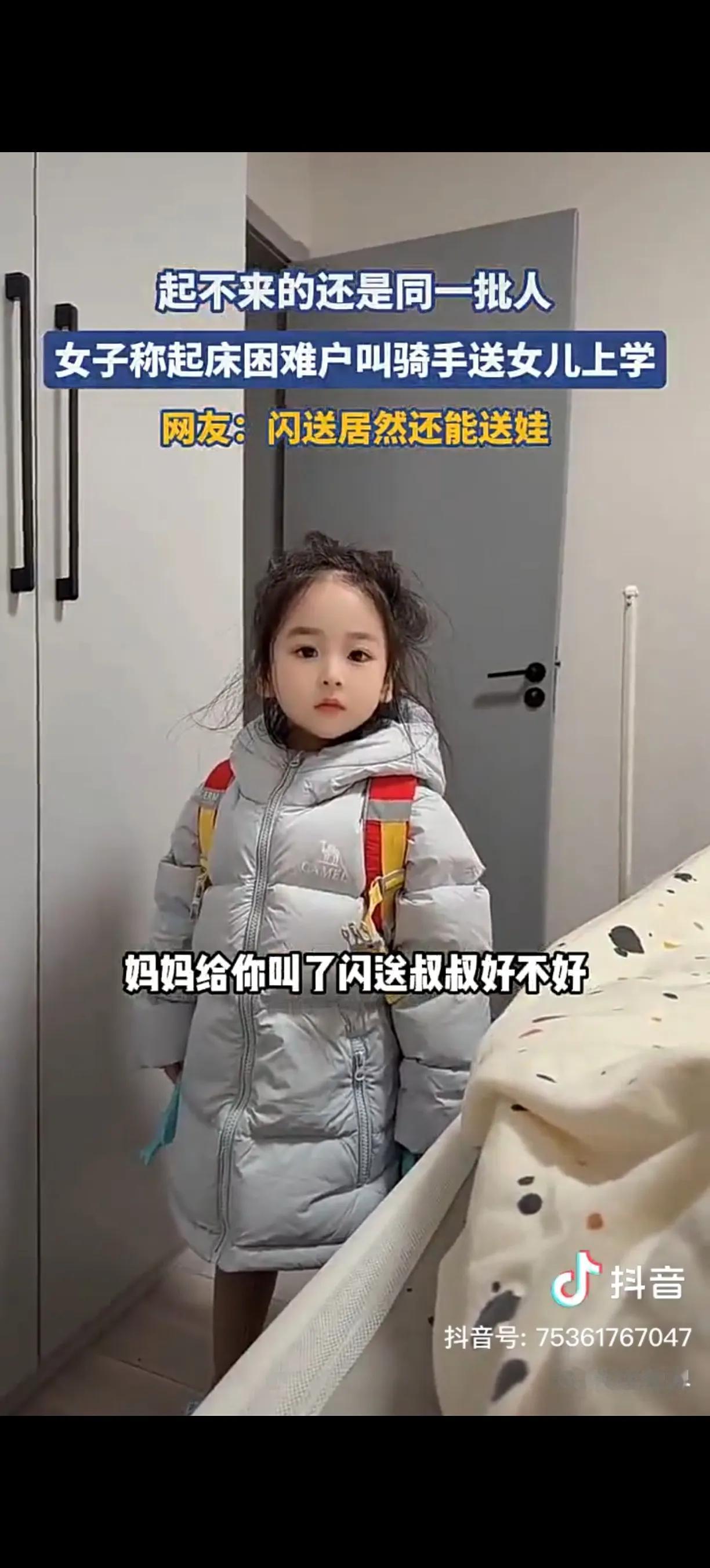 “万万没想到!”天津一幼儿园萌娃收拾好准备去上学,妈妈还躺在被窝,没想到妈妈却说天太冷不想起,叫了个跑腿小哥。 这事在家长群里炸开了锅。有人说这妈妈心太大,孩子上学这么重要的事,咋能交给陌生人; 老师看到这场景,先是一愣,接着赶紧给孩子妈妈打了个电话。 孩子妈妈解释,这天确实是起晚了,外面冷,实在不想动,就抱着试试的心态叫了跑腿,没成想真成了。 这件事你们怎么看?欢迎留言讨论。   网友评论: 这孩子没爸吗?当爸的不能送吗?当爸的工作忙不过来,当妈的又懒成这样,难道当爸的,不应该把这当妈的,好好教育一顿吗?看把我这急成绕口令了。孩子安全大于天!真要有点什么事,一辈子后悔去吧! 这娃的妈妈真是个奇葩,胆子大,也真敢想敢做。这叫林子大了什么鸟都有。她就不该生下这娃来。 这女人心真大也太很,对孩子都能这样下狠手,不怕出事吗?是个男人都不能跟她过。 其实,只要小哥的身份信息是确认的,工作是认真负责的,这样做又有什么不妥呢?唯一要谨慎的,是小哥不能够做拐人买卖的!其次,发生交通事故,小哥要有能力承担相关责任的,或者小哥所在的快递公司要能够承担关联责任的! 有人接单送孩子,这是两全其美的好事呀!关键是孩子自律性强,到点了能起床,做好上学前的准备。宝妈烧高香了! 早送小宝来上学 娃送幼儿园 天津小孩 萌娃上学趣事 天津空港幼儿园 天津女童