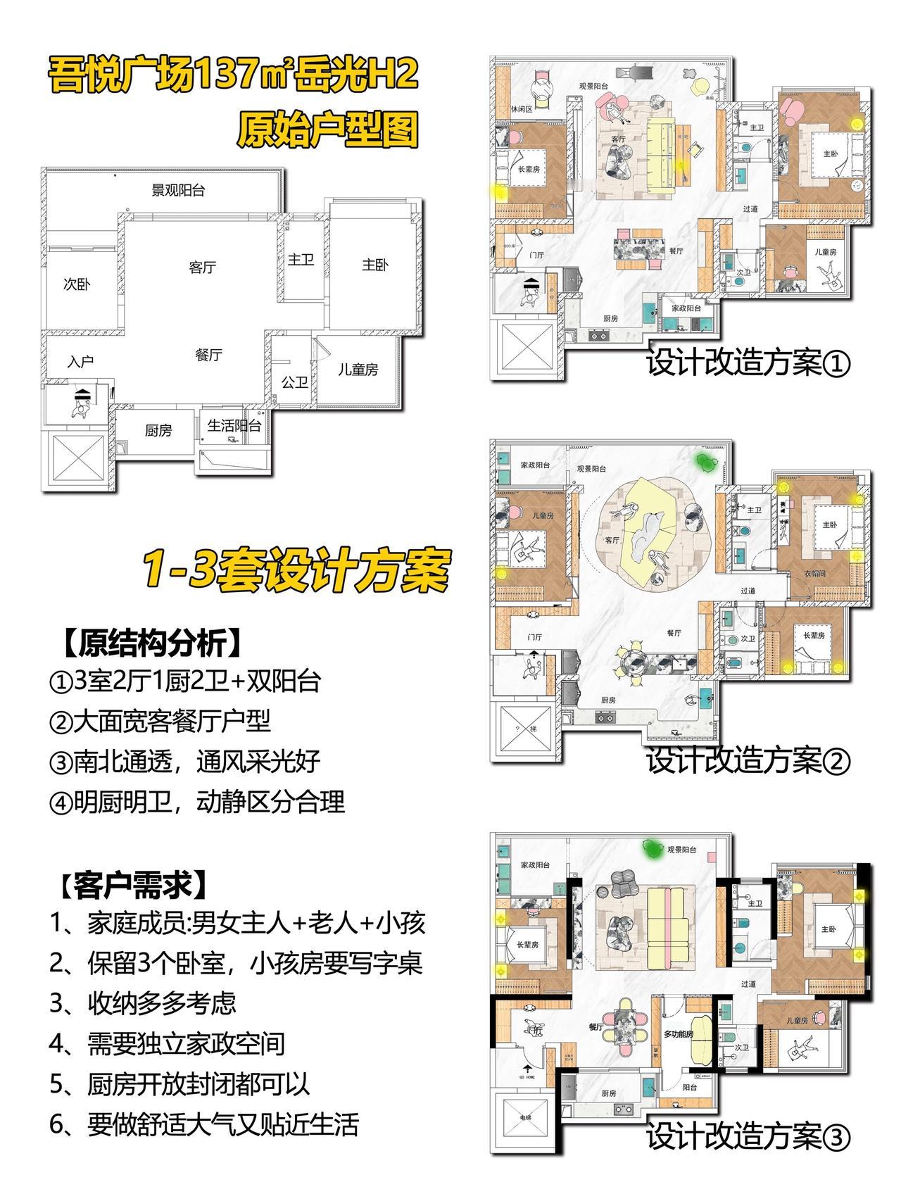叮咚❗️我是阿杰,家装设计师上线了✨ 接上一期贵阳云岩吾悦广场137㎡岳光H3户型后,今天给大家分享岳光H2户型! 项目信息📋 📍楼盘:云岩吾悦广场 🏠户型:平层(岳光H2阳台) 📏面积:137㎡ 🎨风格:现代简约风格 🏠【原始户型分析】 ①3室2厅1厨2卫+双阳台 ②大面宽客餐厅户型 ③南北通透,通风采光好 ④明厨明卫,动静区分合理 📝【客情需求】 1、家庭成员:男女主人+老人+小孩 2、保留3个卧室,小孩房要写字桌 3、收纳多多考虑 4、需要独立家政空间 5、厨房开放封闭都可以 6、要做舒适大气又贴近生活 🎨【设计解说】 用现代简约风实现「极简不简单」 1.通厅扩容:砸掉多余隔墙,借落地窗引窗外景观,悬浮吊顶+无主灯,显大20㎡; 2.收纳功能:玄关定制柜藏换鞋凳+客厅隐形柜+卧室顶天柜,把137㎡装出150㎡的收纳量,换季被、娃玩具全“藏”起来,看着还不乱。 3.厨房区:L型操作台+中岛桌,洗切炒动线顺,边做饭边和客厅聊天,比传统厨房少了“隔离感”。 4.细节暖心:主卧暖棕+浅灰,次卧做“床+书桌”一体,卫浴三分离+壁龛,适配贵阳家庭日常。 👉【关于我】 一位充满热情、细心、靠谱的90后设计师。拥有别墅、洋房、跃层、大平层、普通住宅10年设计经验。为装修设计发愁的你排忧解难! ✅擅长风格 意式、新中式、现代简约、奶油风、宋式美学、中古风、法式风、现代轻奢等… 📄【个人案例】 中铁阅花溪|中铁逸都|中铁阅山湖|阅山湖云著|华润悦府|中海映山湖|茅台广场|美的林城|金融城|融创九樾府|中海印龙泉|华润九悦|龙湖天曜|龙湖湖山原著|万科鸣翠|万科麓山|铁建城|龙湖舜山府|远大美域|观山小区|建发和玺|保利公园 。。。。。。 贵阳装修 吾悦广场 全案设计 贵阳星艺装饰