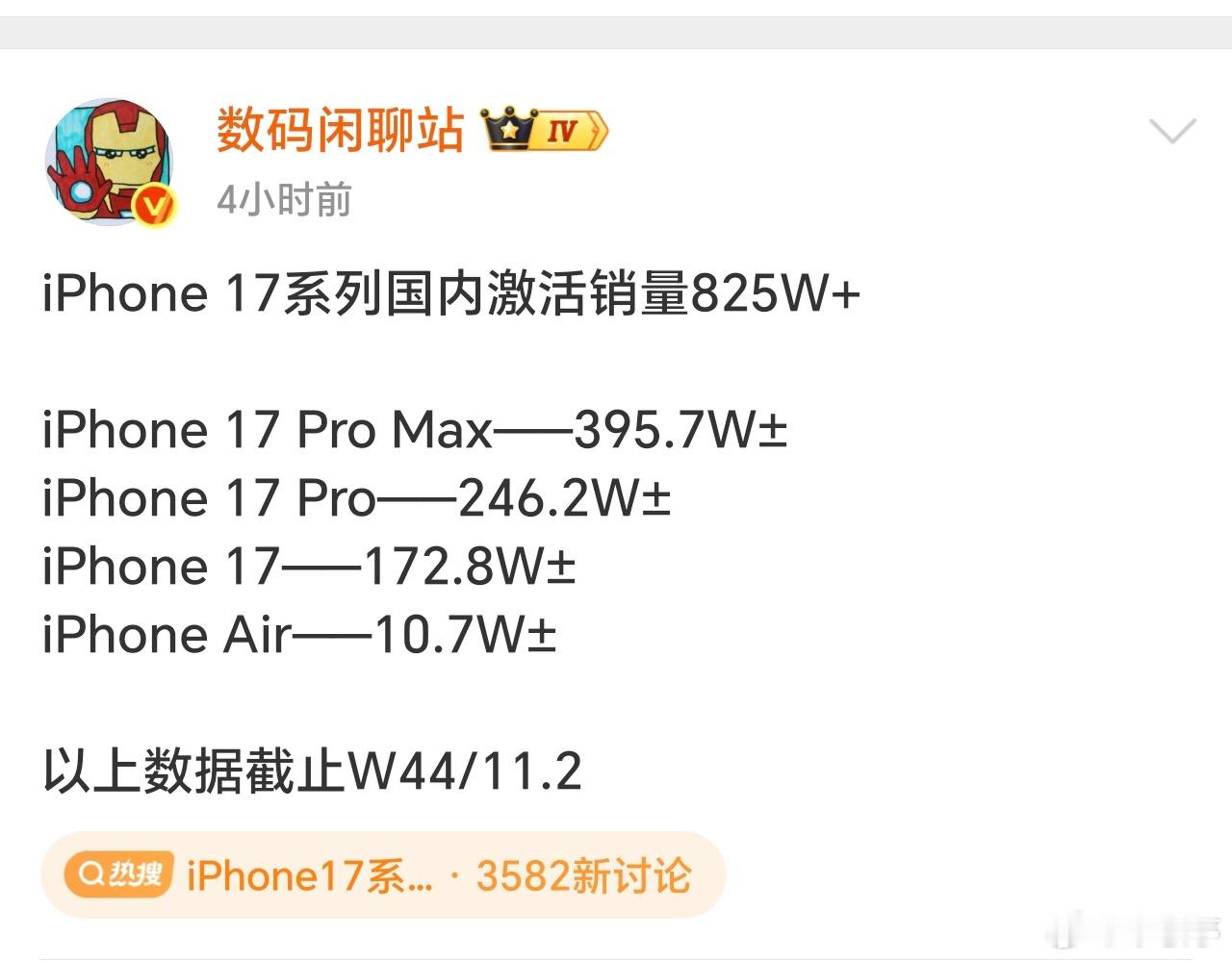iPhone17系列国内激活销量iPhone17系列这次大换代销量确实太牛了,这销量超过国内安卓旗舰总和了,如果华为没被各种制约,应该可以一战!等华为Mate80系列和华为Mate X7的表现吧[并不简单]!