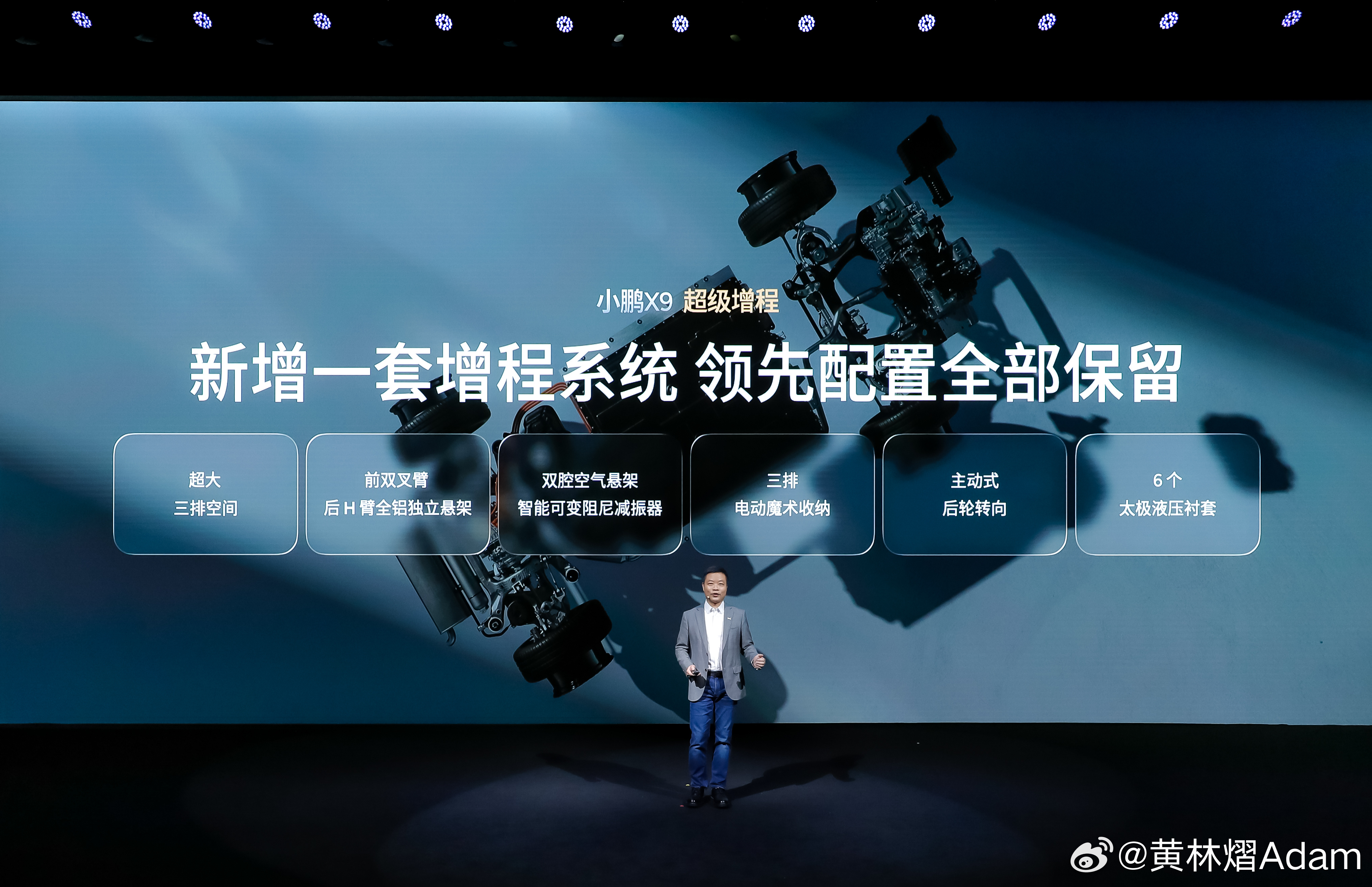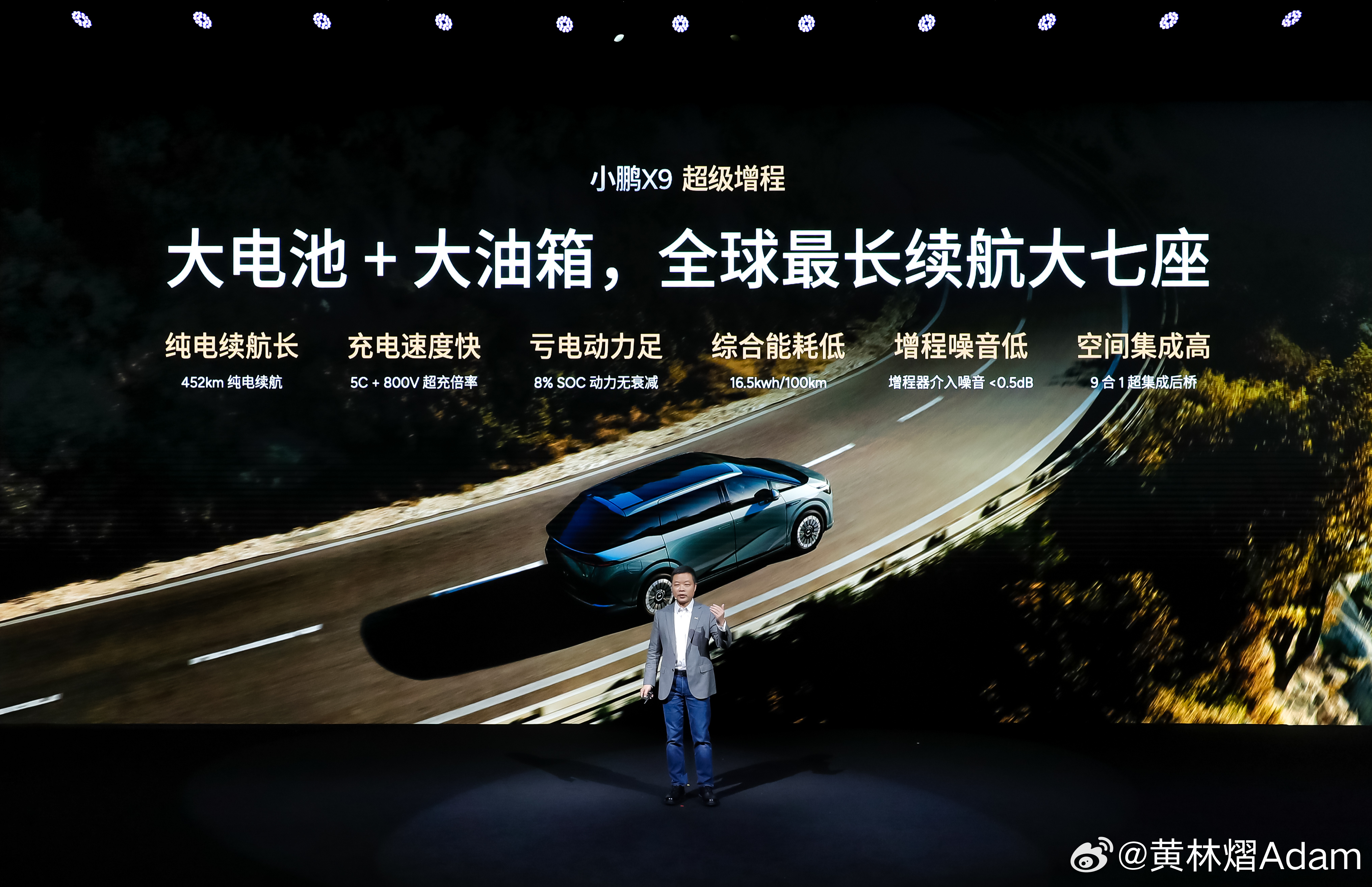 小鹏X9这套新的增程动力,它带了增程专属的超快充磷酸铁锂电池,还给你配了 60L 一个超大油箱,这一套配置下来续航是突破1000公里的大关,再加上超充技术下的加持,大幅度缩短了增程车充电慢,电池小的痛点,完美解决了续航焦虑的问题。