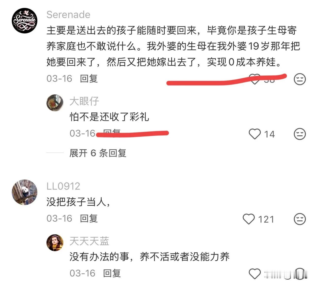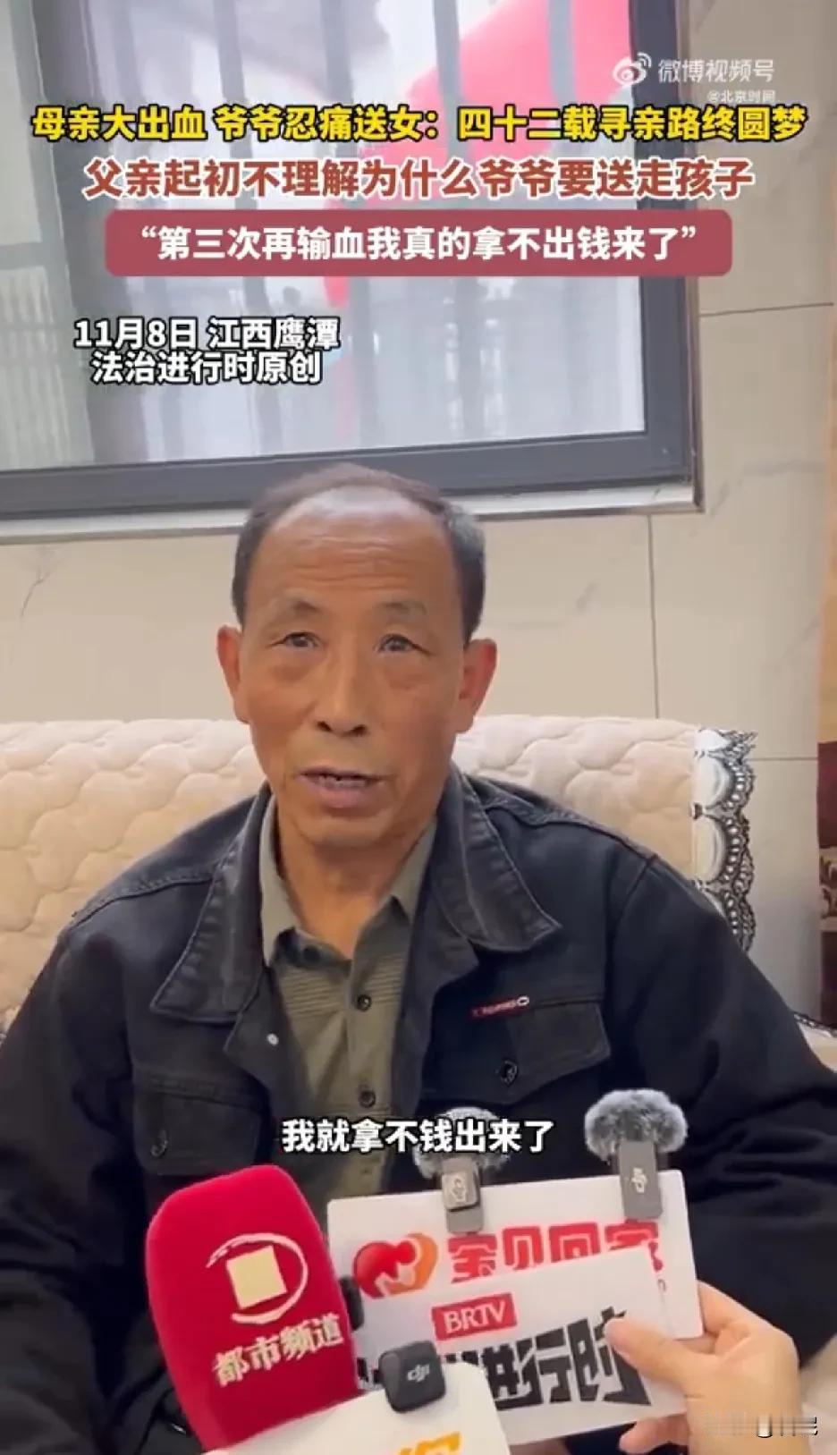江西一女子生产大出血,孩子爷爷将孙女送人,女孩42年寻亲路圆梦。真温情,但温情背后是性别的偏见,遗弃或者拐卖的表现。 女子十月怀胎,努力生下女孩,女孩很健康。“第三次再输血我真的拿不出钱来了。”然后把女孩送走就能拿出钱给女子输血?如果能收到钱,那不是拐卖小孩?如果没有收到钱送人,那不是遗弃吗? 女孩42岁,往回推时间,1982年开始计划生育,所以这应该不是爷爷一个人主意,难怪孩子父亲后来又理解,显然爷爷已经不在人世了。 再说女孩,我无法共情她,明明被亲人送人了,还要回来找。难道养父母对她不好吗?生恩大过养恩?要知道女孩在福建家庭是视为掌上明珠的,可见养父母并没有因为她不是亲生的,而虐待她,待她不好。 当然,女孩脸上的笑容是最珍贵,她觉得值得就可以,幸福就好。