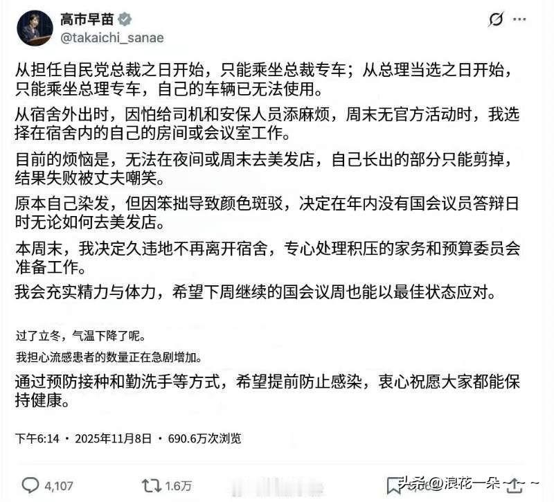 嚯! 才上了几天班,高市早苗就这么多烦恼?不过,倒是学会了发帖子,这是跟特朗普学的吗?从发帖子的内容来看,自己的生活方式改变了不少…私家车也开不了了,头发也没时间打理了,也怕给身边人员添麻烦了,还担心天冷了大家生病了…这操心操的够多的,是不是感觉到这几天的活动被日本网友骂的不轻的原因啊?