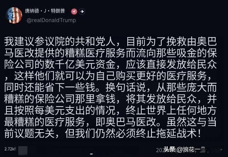 放大招?! 美国天刚刚亮,特朗普又来新帖子了! 眼看着民主党对于“停摆”的事不妥协,他又使出了一招,他要终止奥巴马的医改,他要把奥巴马医改过程中流向保险公司的钱收回来直接给老百姓发钱,让老百姓自己购买他们想要的最好的医疗服务。 不知道他这一招怎么样,反正他就是讨厌民主党的政策吧,一方面用这个战术来给民主党施压,让民主党赶紧结束政府的停摆,另一方面,可以给共和党争点颜面,毕竟现在共和党在州长和市长选举中输得一塌糊涂,🉐变了法子说民主党的坏,给老百姓一块糖吃,到处游说说他自己的政策好。 两党斗过来斗过去,再这样下去,美国要完球了吧?[捂脸]