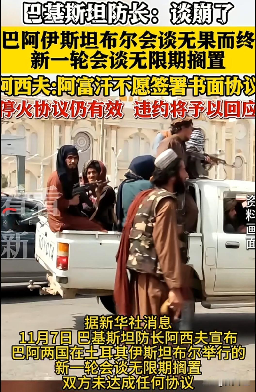 阿富汗和巴基斯坦的会谈又谈崩了!巴基斯坦防长宣布,会谈进入无限期搁置阶段。这个消