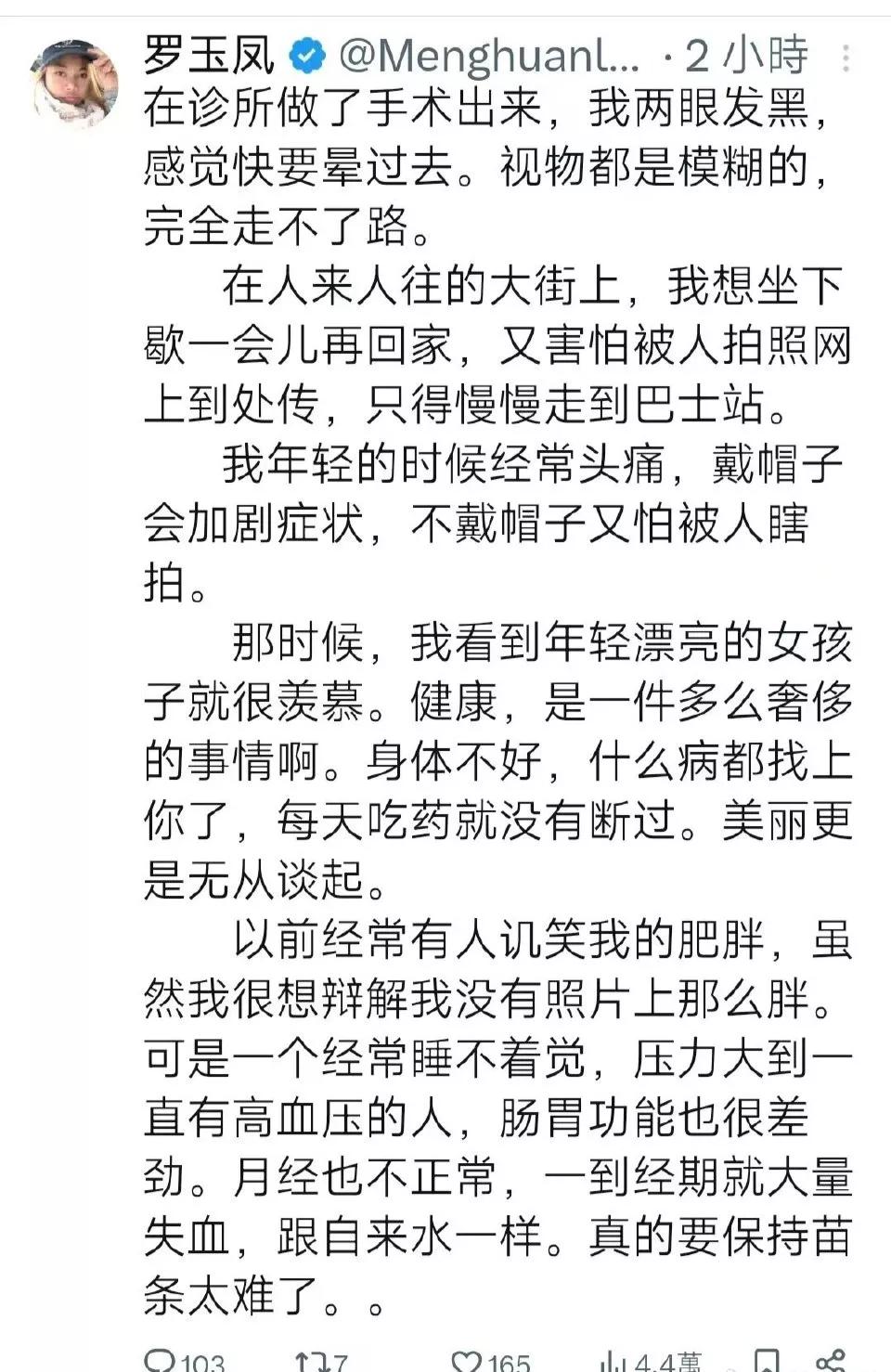 [凤姐因重病而深深叹息(下图1)] 网红鼻祖凤姐最近在自己的平台说,她因为生病动了手术,身体非常不舒服,双眼发黑,视力模糊。 但又不敢在街头停留,因为怕被有心人拍了,然后又发到网上乱说。 她感叹地说,原来健康是多奢侈的事啊。 这些年来,凤姐做过美甲,也做过超市收银员,收入都不高。 她说,美国也有潜规则,下层向上层爬,也有看不见的巨大阻力。 她一直租住比较便宜的房子,甚至长期往地下室。 但她毕竟是一个求上进的女人,甚至靠自己不多的收入,考上了一座不错的美国大学。 不过,她最近染上了一身病,牙齿也烂掉了三颗,一直没补上,或者是没钱,或者是舍不得钱。因为在美国补牙很贵。 2009年,凤姐带着18万美元远赴美国,8万用于移民,十万用于傍身。可见,当时的凤姐,在国内还算富足的。 一晃过去了十多年,如今已年届不惑的凤姐,仍孑然一身。她是否后悔当初的选择?我们不得而知。