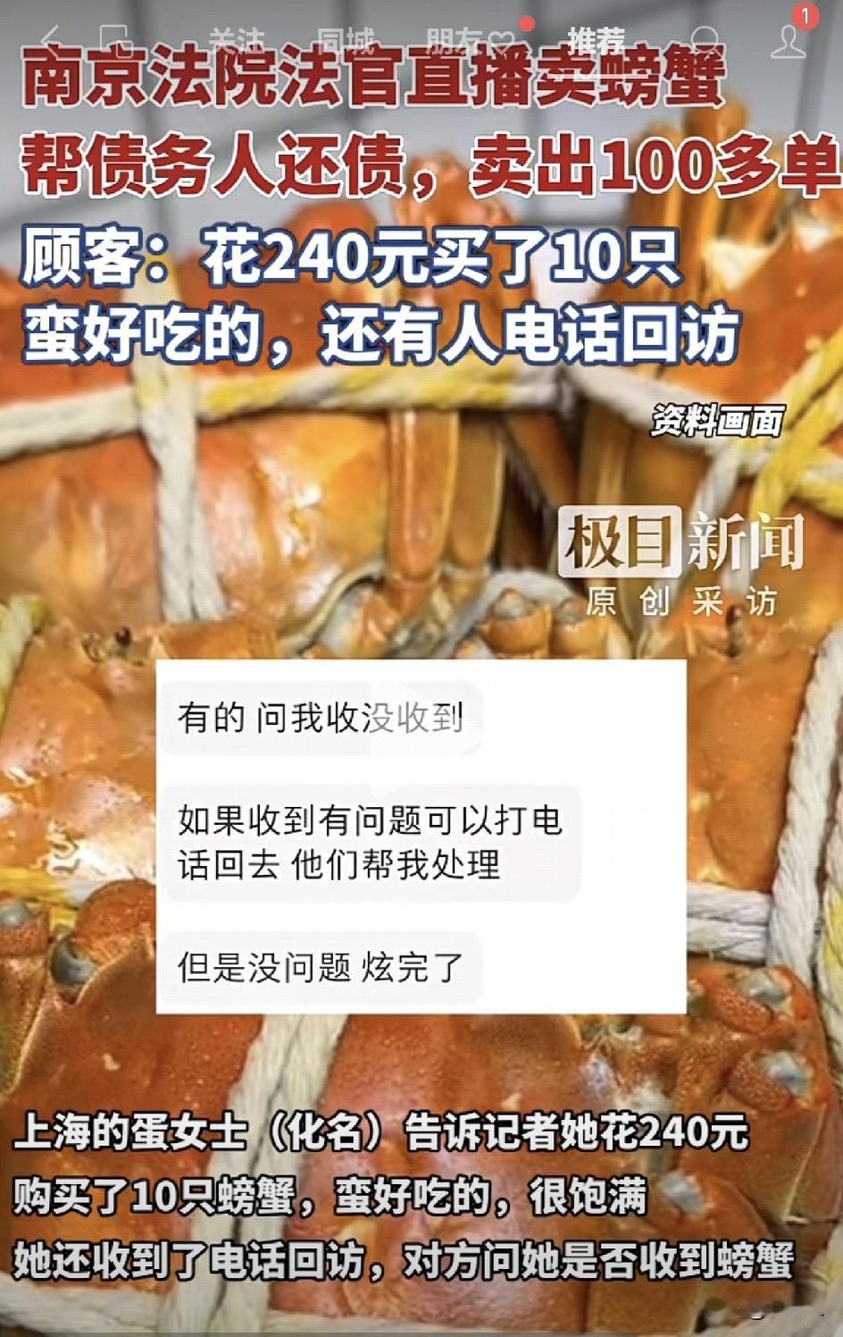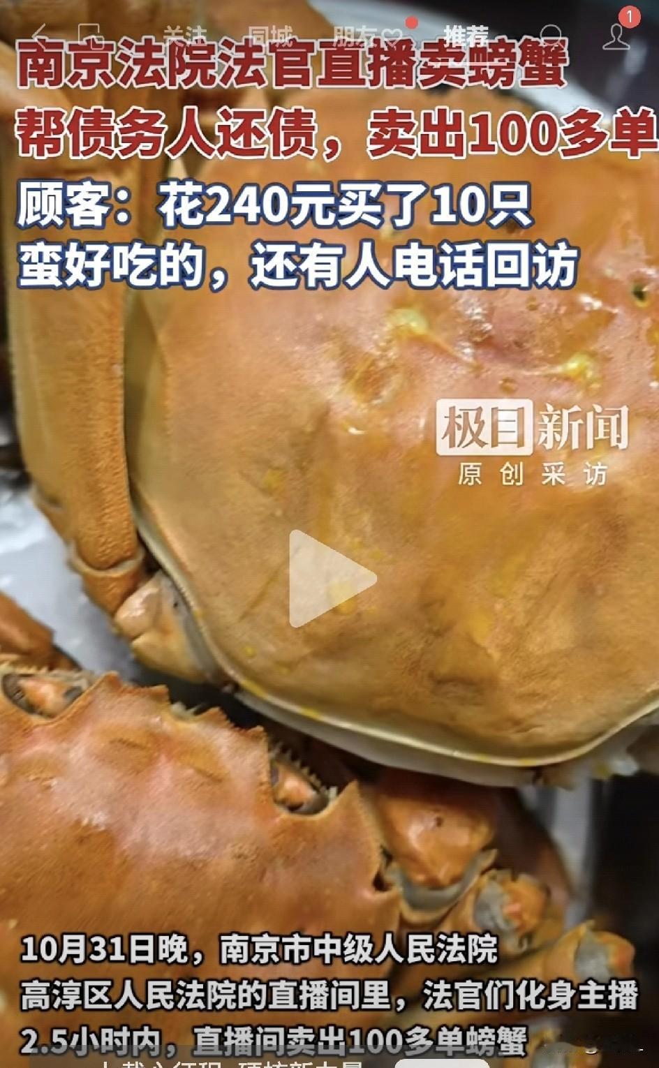 法官直播卖蟹,一场“破圈”的法治温情实践! 10月31日,南京。高淳区人民法院携手京东资产交易平台推出的司法变卖直播专场,引来20多万人次在线围观。 这次的带货主播们是身着制服的法官,他们不再是法庭上严肃履职的法官,而是破产企业“秋兰家”大闸蟹的代言人。 法官直播卖螃蟹,确实第一次遇见,也吸引了不少网友们购买,毕竟法官们的制服就是响当当的品质保证啊。 上海的单女士,就是其中之一。单女士花了240元下单了5公5母,下单的第二天就到货了。 单女士在社交平台分享了这次特殊的直播购货经历,“这些螃蟹挺饱满的,特别是母蟹黄蛮多的。隔天就到了,发货前打电话确认收件信息,签收后还有回访电话。” 法官们的这次直播带货,原来是为了帮助申请“类个人破产”但从未逃脱过债务责任的秋兰一家,筹集赔偿资金。 秋兰的父母原来是跑航运的,后来因为出了意外不得已放弃航运,回家来养殖螃蟹,却又因为没有技术,债务不减反增。债务最高时高达80多万,是压在秋兰一家心头的大山。 秋兰母亲的一次交通意外,让这个家庭更是雪上加霜,需要拿出26万的赔偿金。 即便如此,秋兰一家也从没有推脱过债务责任,每年年底都会准时将分期赔偿金按时送至法院。 2025年9月,秋兰父母向法院申请“类个人破产”,法院在调查了秋兰家这些年的还款情况、账务情况和经营状况后,和债权人协商。 20名债权人一致同意:除交通事故赔偿金需全额清偿外,其余债务按本金九折一次性清偿。 为帮助秋兰家筹集偿债资金,高淳法院量身定制了“资产处置+金融纾困”组合方案:如果螃蟹出售后仍有资金缺口,将协助向银行申请低息长期的“淳信重整贷”。 这就有了这一次别开生面的司法变卖直播专场,严肃法官变身带货主播的故事。 大约两个半小时的直播时间内,一共卖出了162单螃蟹,金额达5.7万余元。 这场直播基本清空了秋兰家蟹塘内目前已成熟的螃蟹,卖货款项将全部进入法院监管账户,用于偿还秋兰家的债务。 这场别开生面的直播,远不止是一次简单的“带货”,它是一个融合了法治精神、人性温度与网络传播的完美案例。 它的成功在于,巧妙地将 “严肃法治” 与 “人间烟火” 相结合,用 “极致反差” 吸引眼球,用 “真情故事” 打动人心,用 “程序正义” 巩固信任,最终用一个 “圆满结局” 完成了正能量的传递。 期盼这场司法创新与社会温情的双向奔赴,能帮秋兰一家早日走出债务阴霾。更期待如此有温度、有力度的司法创新能不断涌现,让老百姓真切感受到法治的暖意与力量。 法不容情,但法可以有情! 信息来源于极目新闻,侵联删!