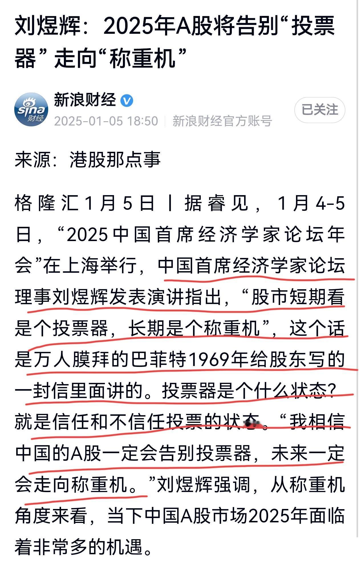 知名经济学家刘煜辉的演讲成了热点,媒体报道各有侧重,全面学习梳理了一下,觉得还是很有价值的,谈谈自己的感悟。 A股转变:告别“投票器”,走向“称重机”;可以这样理解:原来是信任不信任的投票状态,投资股市可有可无。将来是经济晴雨表,经济发展得越好,股市上涨也就越好。经济发展前景明确,股市慢牛也就确定了。 市场机会:现在是“人生发财靠科创”,过去讲“人生发财靠康波”。机会离不开时代剧本,原来奔小康,解决短缺经济问题,产业从无到有从小到大,发财靠康波;现在产业升级,从大到强,从跟跑到并跑到领跑,新的工业浪潮兴起,创新是推动经济发展的动力,科技的突破会创造巨大的资产溢价,改变国家命运,也改变个人财富。过去买房子能致富,投资传统产业股会涨,以后就要瞄准核心科技股了。 大国博弈:最集中的就是能源体系和科技体系。一个王朝的奠基石是能源体系和科技体系,科技奠定竞争优势,但没有能源保障就是无米之炊,所以科技和能源成为是大国竞争的关键高地,当然也是优先发展的高地,投资机会也就很多。 投资赛道:国产算力链、储能、循环经济、材料工业体系。十五五规划要完成,中国在未来五年、十年内“登顶”,那确立的新兴产业和未来产业就是支撑经济发展的支柱,这里面走出大公司的机会就很多,当然也是投资的重点方向。 A股走势:短期:年底调整,中长期:看好。今年A股市场活跃,是个大丰之年,年底收官阶段止盈需求强烈,所以市场有调整需要,他预测有两三百点的幅度。实际上,A股8月底就开始调整了,指数围绕4000点整理,现在上攻缺乏动力,获利筹码有待消化,下跌也没有大的空间,在长期看好的情况下,下跌就会有承接。一旦利好事件触发,A股就会再上一个台阶。 投资就是投资未来,下注一个公司的未来,一个行业的未来,一个国家的未来,所以不能只盯着眼下公司的基本面和技术指标,要抬头看看宏观,看国家的发展,这样才能把握大势,这时候听听经济学家的观点还是有好处的。