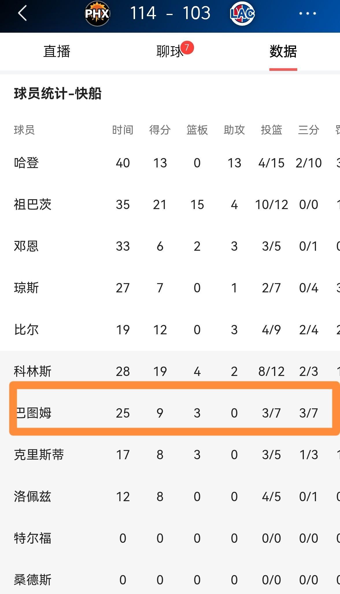 在今天快船主场以103:114输给太阳的比赛中,老将巴图姆在攻防两端都打出了无可争议的表现。全场比赛下来,巴图姆替补出战29分钟,三分球7中3得到9分3篮板1助攻1抢断2盖帽。 值得一提的是,作为一名36岁的老将,巴图姆在第四节比赛的关键时刻连续命中了两记三分球,帮助球队一度看到了赢球的希望。