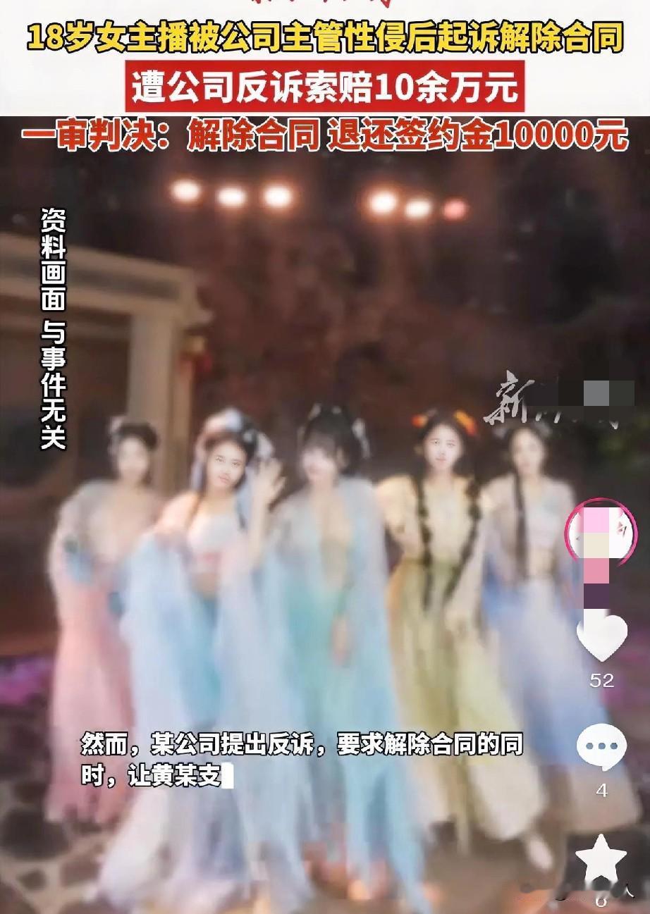 18岁女主播被公司主管性侵 却遭公司反诉索赔10余万元 法院→解除合同,退还公司一万元签约金 👀大家看新闻了吗?《红星新闻》权威报道: 黄某,18岁女孩,打算进入某直播公司做主播,并签了1年合同期。 然而,今年6月的某天,主管陈某,以谈工作为借口,约她出去,随后实行了性侵。 事发后,黄小姐身心受到创伤,无法再去上班,因此一纸诉状,把公司告上法庭,要求解除合同。 然而,公司却反诉,诉求: →黄某支付10万元违约金; →退还15000元签约金及收益3818.04元; →支付律师费:6000元; →陈某行为系其个人行为,与公司无关。 🏤法院判决: →解除合同; →黄某退还违约金10000元。 👮帽子叔叔: →对陈某某涉嫌强奸一案进行立案侦查。 (免责声明:消息来源于红星新闻权威报道,图片来源于网络,与内容无关)