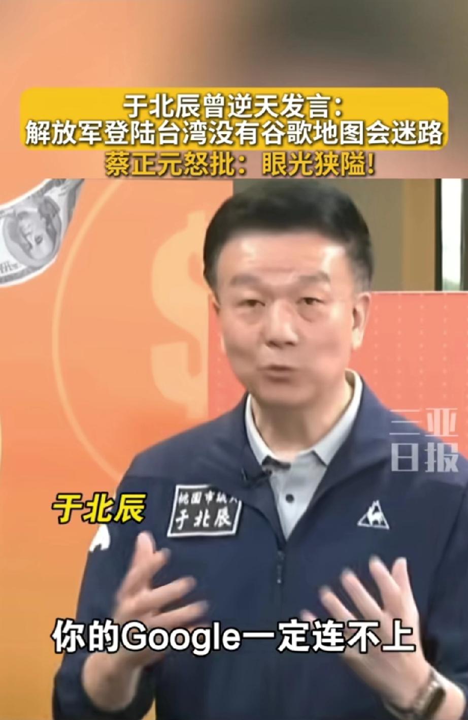 于北辰绝对是我们的同志,要不然没法解释。 他的逆天发言:解放军登陆台湾没有谷歌地图会迷路,你的Google一定连不上,他会把你屏遮住,你一定找不到Google。你没有办法导航,你怎么办? 高德地图在台湾都开通了,但凡是个正常人,都不可能说出那么无脑的话,又不是生活在石器时代,如果不是井底之蛙就是为博取眼球博取流量。