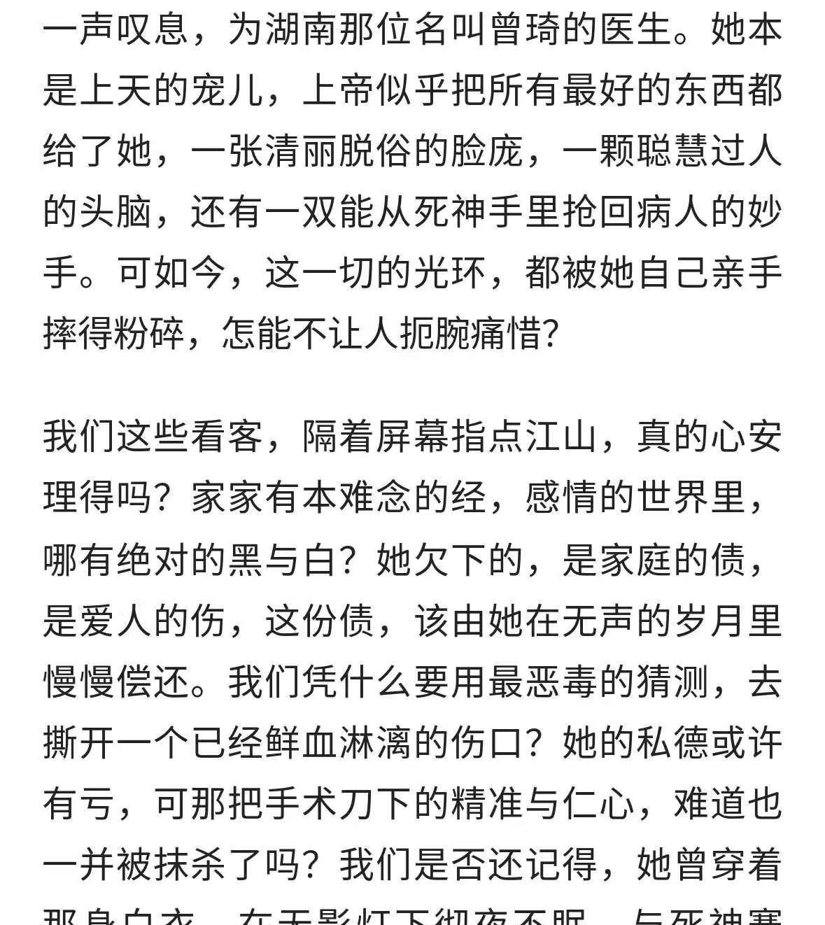 这个事件,我依然坚持曾医生错付了。留下来以后也很难面对同事家人,不如离开本地去一个陌生城市重新开始。 我在这里喊话祖院长:如果你是一个男人,就把所有责任全部揽下,保护好曾经为你付出的你的女人,因为她真的不容易。 说明祖院长有利用价值,如果男的是普通人,曾医生会这样吗? 医院留你你好意思还待的下去吗?万恶淫为首,不信且看高官落马。