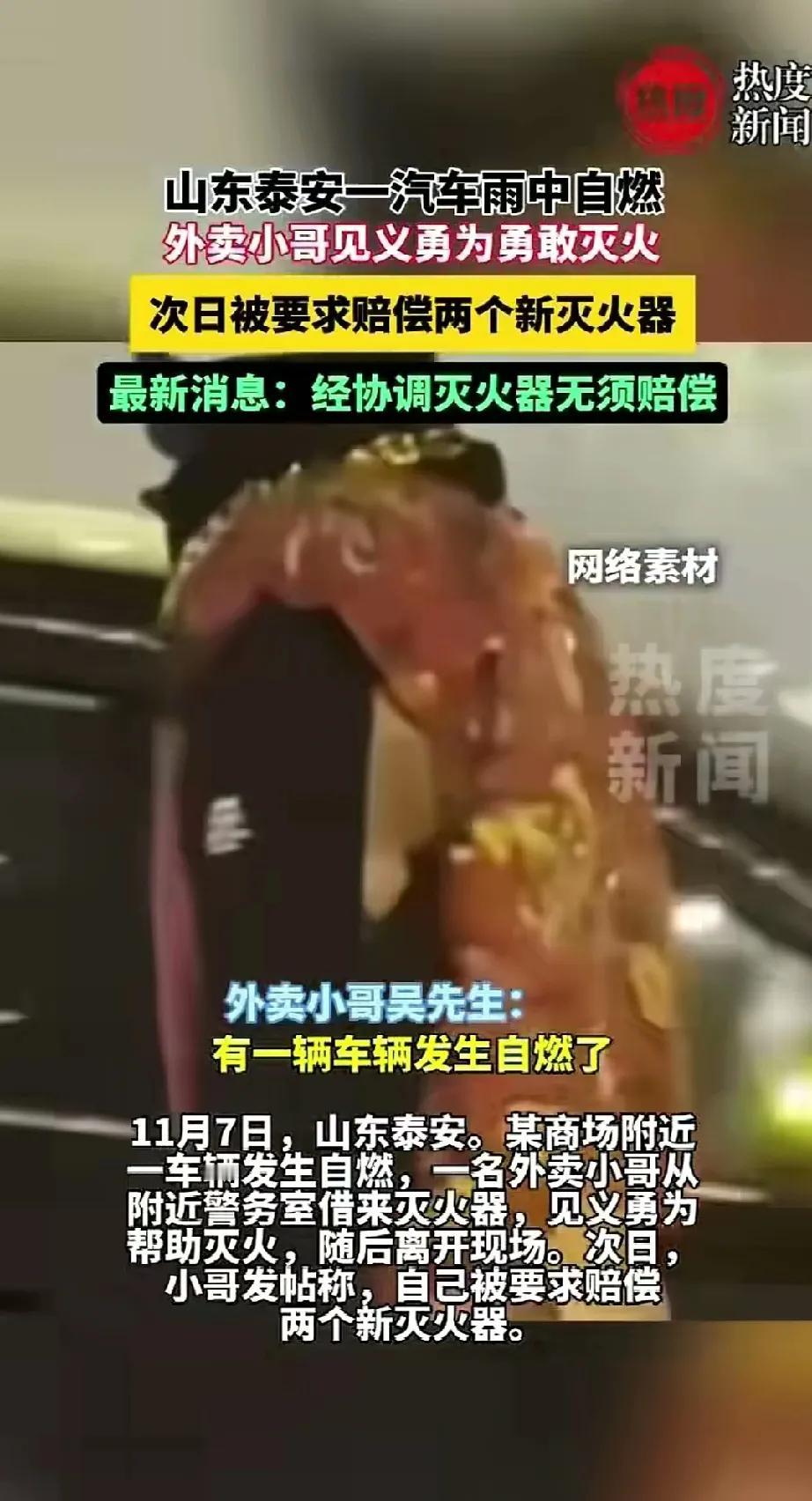山东泰安的这名外卖小哥估计也没想到,自己冒雨,把单子放到一边,冒着危险帮助起火的车灭火,却被要求赔偿灭火器? 11月7日,山东泰安的一个外卖小哥,在送餐途中,遇到一辆起火的小车,眼看着自己手里的单子可能会超时,小哥没有丝毫犹豫,下车就去找灭火器。 这个季节的雨,已经有了寒冷,但是外卖小哥没有丝毫犹豫。 看了一眼环境,发现周围有个警务室,外卖小哥跑过去询问有没有灭火器,在征得同意后,外卖小哥拿起灭火器冲向起火的车辆。 火被扑灭后,外卖小哥就把灭火器放在的车辆前方,接着去送外卖。 结果隔天,外卖小哥就发帖,声称收到了要求赔偿两个新灭火器…… 后来经过协商,灭火器不用外卖小哥赔了…… 外卖小哥提着灭火器,大步向前的样子真的很帅!