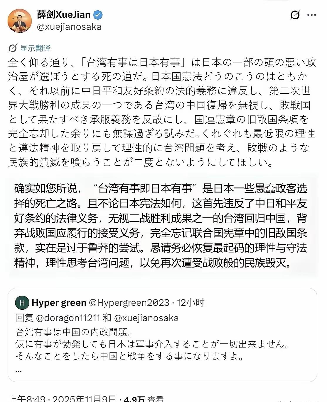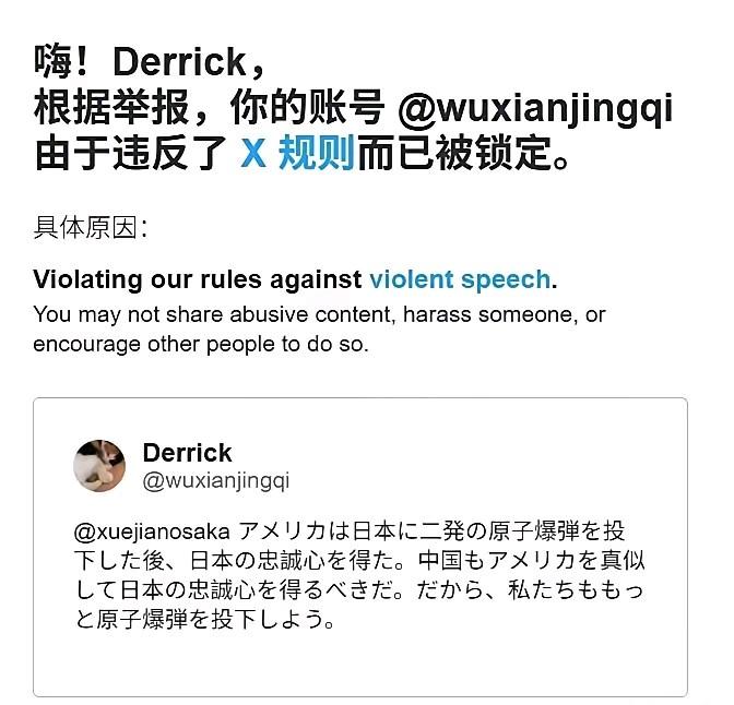 我国驻大阪总领事的X账号被X平台封停了!只因为他连发两帖强硬回击了日本首相早苗的“台湾有事,日本动武”的妄言,遭到日本右翼举 报至X平台,X平台就将薛大使账号封停。 坚决支持薛大使的正义之言,坚决反对X平台的封停行为!早苗放狠话,只会成为笑话!她敢动,那就新账旧账一起算!