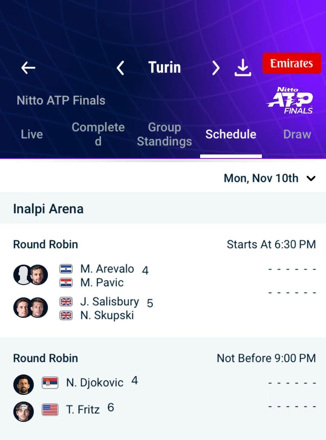 2025ATP都灵总决赛第二日的赛程也已排定,如果小德如期参赛的话他将在北京时间11/10号周一晚上21点与弗里兹交手