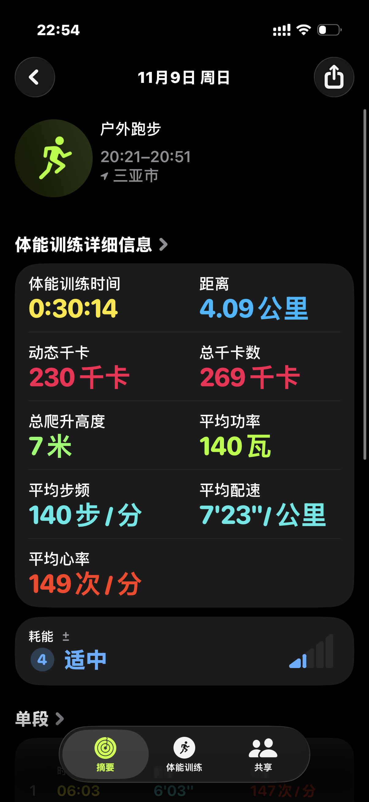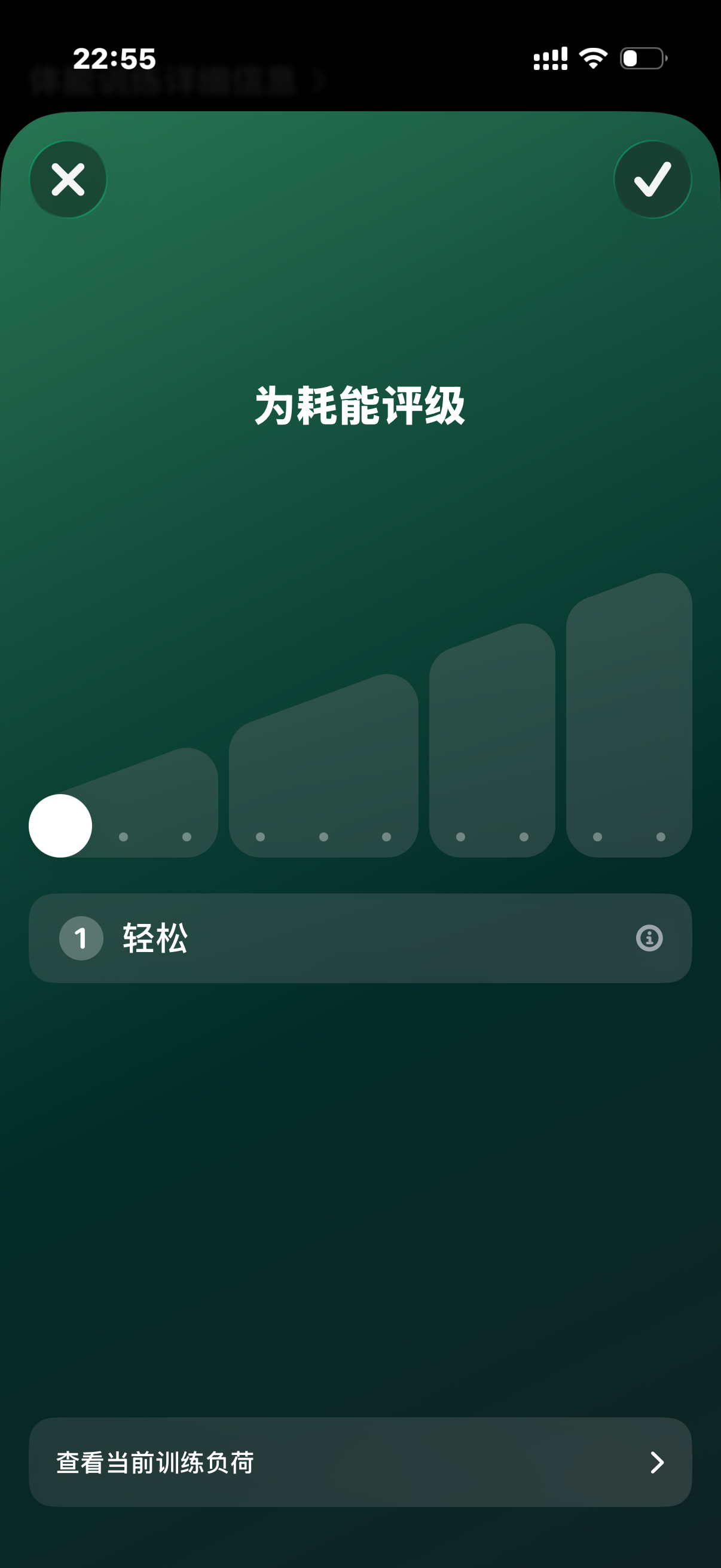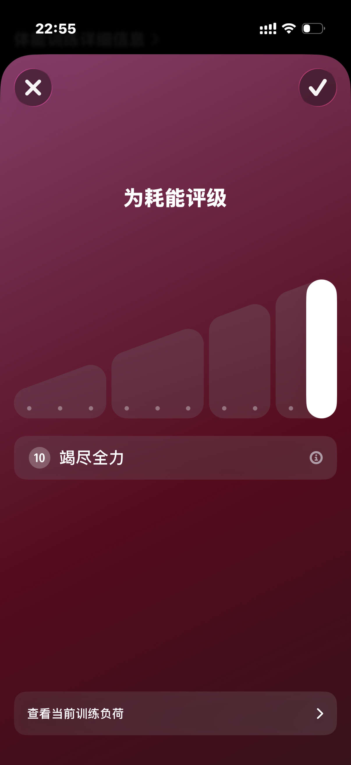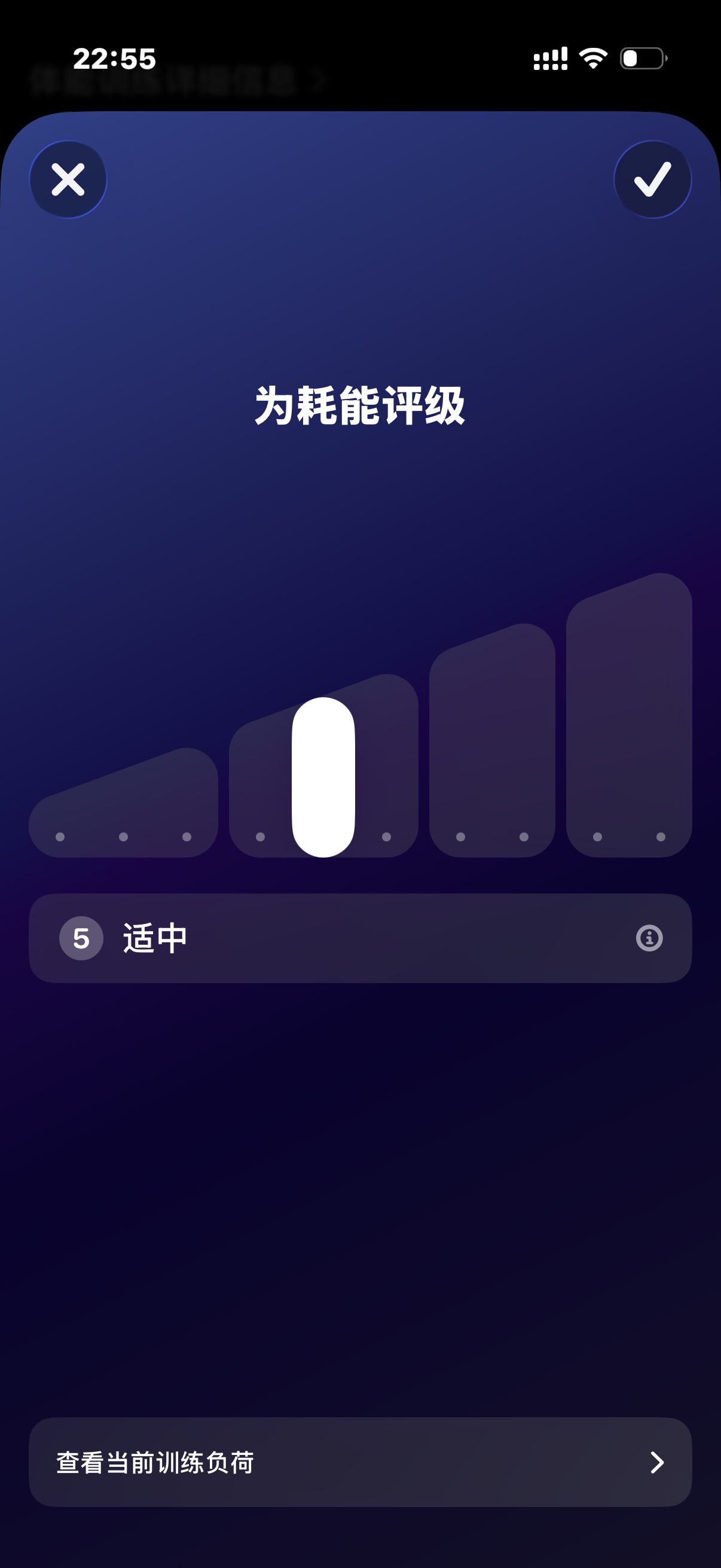 今晚跑步,发现苹果健身有耗能评价体系,他自己会根据心率速度等多方面进行评级,但你自己也可以主动选择,最轻松的为绿色,中间蓝紫色,最累的是深红色,这个功能很好,建议安卓进行强兼!
