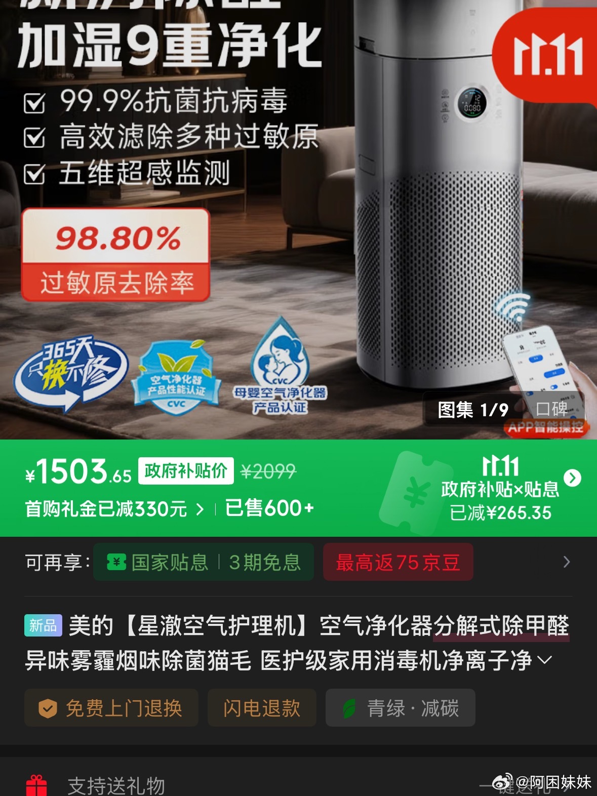 我前段时间看小米这个净化器1500,现在国补加上双11便宜了近300元。最近家里