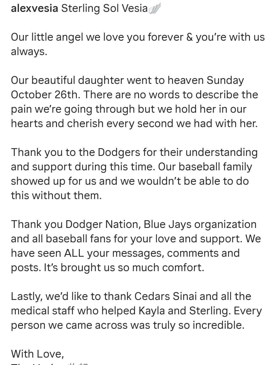 Vesia😢 终于有消息了,但是是令人心碎的消息… 🙏🙏🙏🙏🙏🙏🙏 洛杉矶道奇