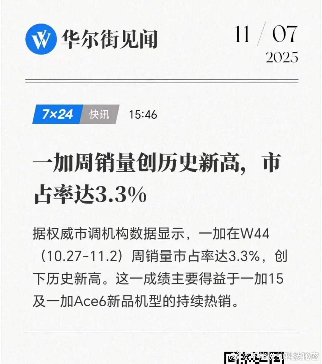 一加周销量创历史新高、市占率达3.3%。据权威市调机构数据显示,一加在W44(10.27-11.2)周销量市占率达3.3%,创下历史新高。这一成绩主要得益于一加15及一加Ace6新品机型的持续热销。一加15