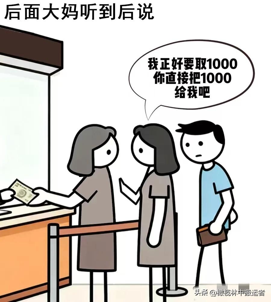 趣味漫画:今天我去银行存钱,前面大妈:你好,我要存1000,后面大妈:我正好要取1000,你直接把1000给我吧