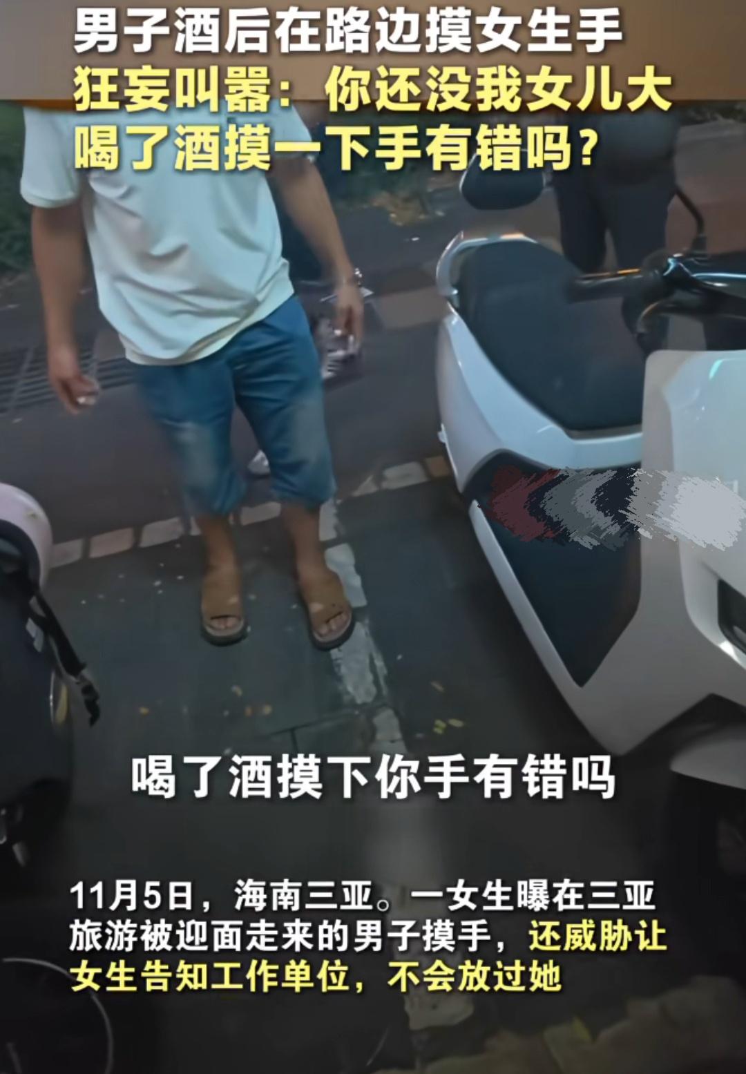 海南一男子酒后马路上摸女生的手,狂妄叫嚣:“你跟我女儿一样大,喝酒了摸你一下有错吗?”女子称,在三亚旅游时,马路上遇到一喝酒男子,他摸我的手,还说我跟她女儿一样大,喝酒了摸你一下手怎么了。我报警后,他还威胁我在哪工作,让单位收拾我。民警到达后,男子狡辩只是走路不小心碰到了。民警调查取证后,将男子拘留了24小时。