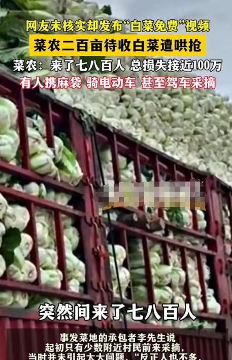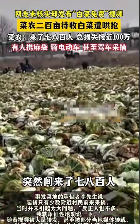 “得寸进尺!”内蒙古赤峰,男子承包了200亩地种大白菜,辛苦了一年,眼瞅着要卖钱了,万万没想到,突然来了700多人,拿着麻袋,骑着电动车,甚至开车来哄抢,男子损失高达100万,一年白辛苦了。背后的原因,竟是有人使坏,在网上发布“白菜免费”的视频,当地媒体未经证实也开始转发,男子崩溃。 农民一年辛苦到头就指着好收成,开开心心过大年。谁曾想竟惨遭“零元购”。 这次事件的主人公李先生承包了200亩的地,加上今年大丰收本以为能赚个盆满钵满。 却被一场哄抢,彻底失去了希望。 起先是他发现近期总有一些附近的居民来自家地里面“偷菜”,可他没有在意! 你日常想要吃点白菜可家里没有了,来找他也会热心给你点。 本以为是做了好事,却为更大的一场灾难埋下了祸根! 也许是一传十,十传百。本来是可以让邻里尝一尝味道,不知怎么就变成了免费菜场。 突然他家的地里面涌现了很多的人,拿着袋子开始疯狂采摘。 李先生一看这架势不对啊,怎么来我这儿吃自助餐了。 于是赶紧叫停,但人数实在是太多根本就没有多少人听他讲话。 拦都拦不住,地里的白菜很快就被糟蹋地不成样子。 后面他通过打听才知道,有人在网上散布这里可以免费采摘白菜的谣言。 甚至就连当地的媒体都有报道,李先生听到后是有苦难言。 而且正值家家户户屯粮食,有些人要做酸菜的季节。 这则消息更是让人心向往之,每个人都拿着大麻袋有的骑着电瓶车,还有的直接开来了汽车! 这有种要把地里的白菜搬空的架势,场面一度陷入了混乱。 按照当时的市场他一亩地可以卖五千块钱呢,你想想这两百亩该赚多少钱啊! 再加上今年的白菜长得格外的好,李先生以为肯定能卖出好价钱。 可人算不如天算,不仅一分钱没有挣到现在看来全是亏损。 今年到底该怎么过活都成了大问题,想到这里一家人真的是快要哭出来了。 自己一家人老实本分,也没有与人结仇,到底是谁要与自己过不去? 竟然出如此毒策。 自己辛辛苦苦一年到头结果摊上这档子事儿,赔上了足足一百万可谓是损失惨重。 而后李先生当然不愿意,请求相关部门援助拿回自己的损失。 一小部分人还愿意将钱结算给李先生,但大部分人依旧置若罔闻。 坚持称是看到新闻来的,到地方才知道不对劲儿了。 这是媒体的失责,与他们没有关系要罚也得罚无良媒体! 还有一些人更加过分,他们就赌当天来的这么多人不可能全都抓走,甚至扬言有本事你就把我们全告了。 反正白菜已经进我们肚子里面了,你能拿我怎么样! 真是令人愤恨不已,你们吃白食还有理了。 人家投入那么多的成本难道就是为了让你们占够便宜吗? 凭什么老实人要受你们这样的欺负,而散播谣言的媒体又安得是什么“好心”? 还有人怀疑突然一下子来了这么多的人,肯定是有组织有预谋的,说不定是对家干的。 但事情真相到底如何还在调查中,希望能尽快还李先生一家一个公道! 对此大家有什么看法呢?如果生活中是你碰到你会怎么做呢?欢迎大家在评论区里留言交流。 信息来源: 网友未经核实发布“白菜免费”视频,数百人在内蒙古一菜地“免费摘白菜”,菜农损失近百万,知情人:有少数人还钱菜农没收,政府部门正介入协调 潇湘晨报