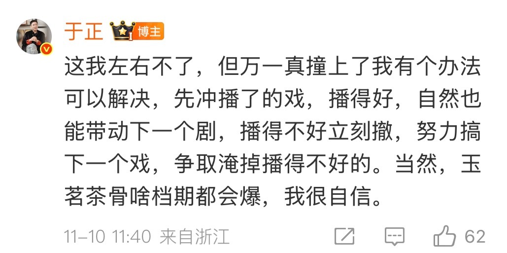 疑似《江山为聘》剧组的人说这部剧开不出工资停拍了,于正维稳说刚还收到了来自吴谨言