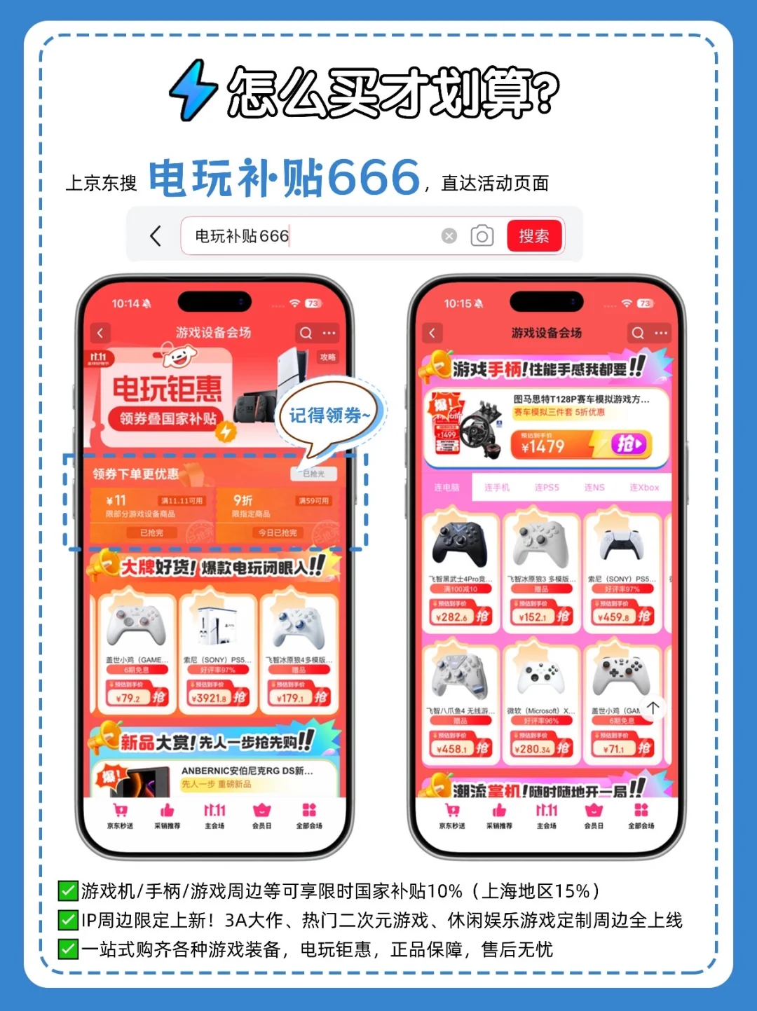 ✅游戏机、手柄、游戏周边等可享受限时国补10%(上海地区15%),覆盖全国,性价比很高。
