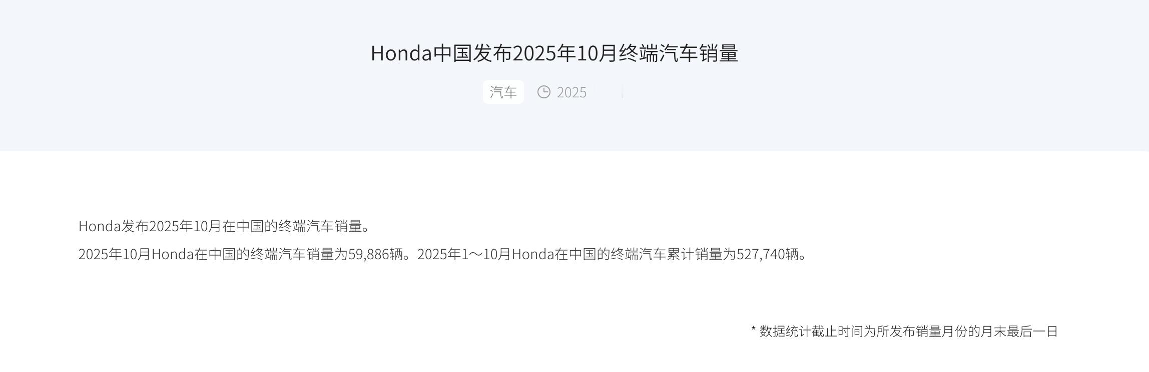 本田中国:2025年10月Honda在中国的终端汽车销量为59,886辆,同比下滑21%
