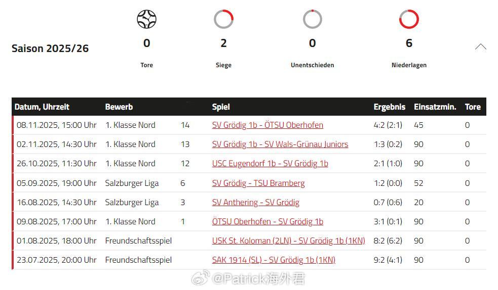 郭晨希 截至上周末,效力于奥地利格勒迪希俱乐部的2006年门将 郭晨希 代表一线队(第4级别)替补出场2次、代表B队(第7级别)首发出场4次,共计出场6次。积分榜上,格勒迪希一线队12胜3负,落后榜首2分高居第二;B队仅取得3胜1平,排名倒数第二。接下来联赛将进入冬歇期,直到明年3月才会重新开战。