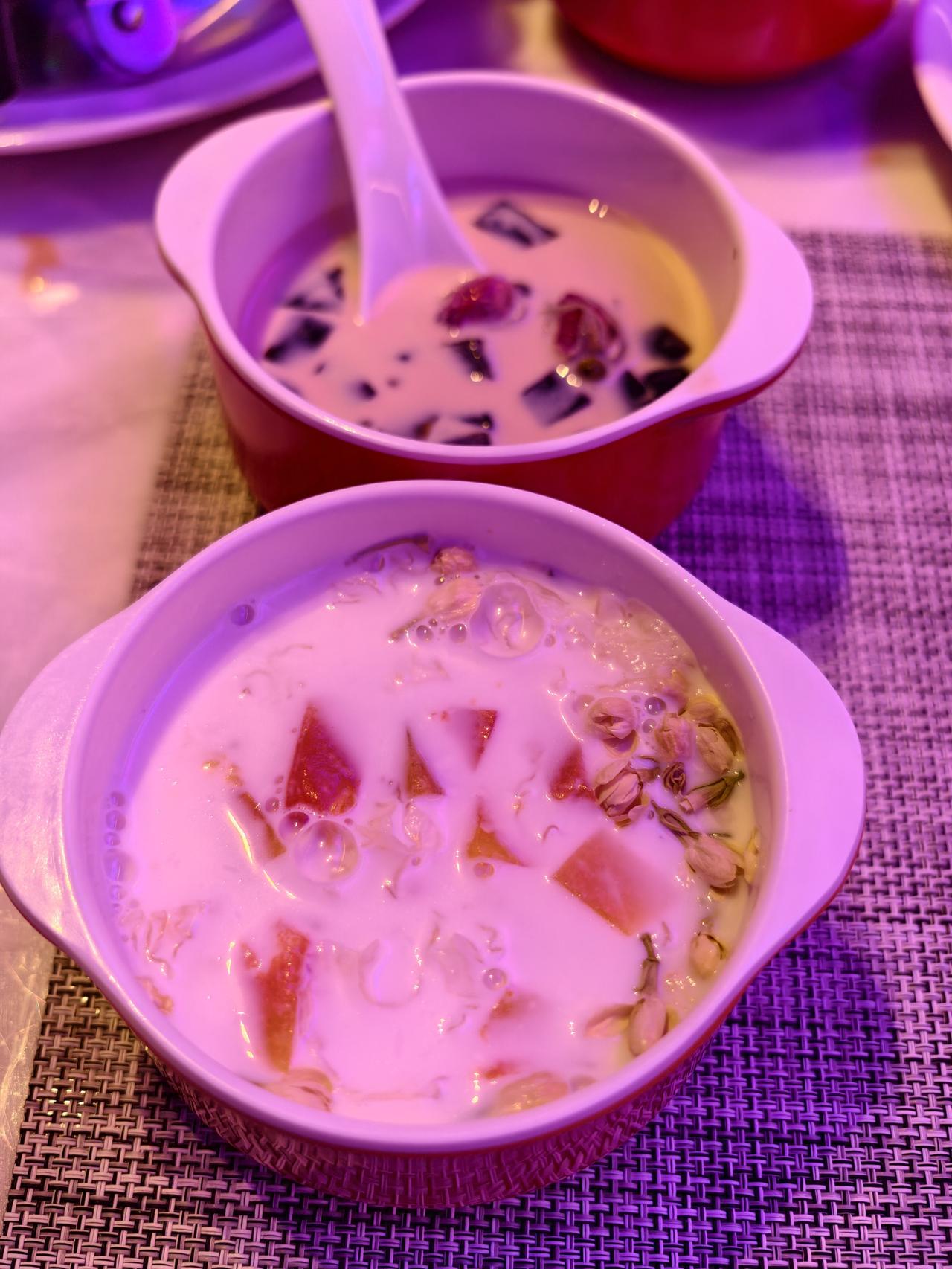 两份甜品,一个鲜乳龟苓膏,一个木瓜椰奶银耳汤,都是热乎乎的,先喝哪个[呲牙]
