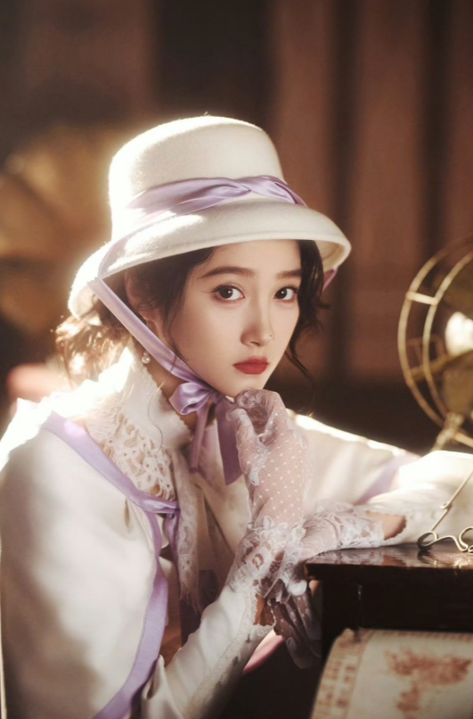 这次的造型就蛮适合她的,身穿旗袍搭配珍珠耳饰,蕾丝手套很有年代感,低盘发造型加上小礼帽,尽显温婉优雅,活脱脱的留洋千金小姐即视感