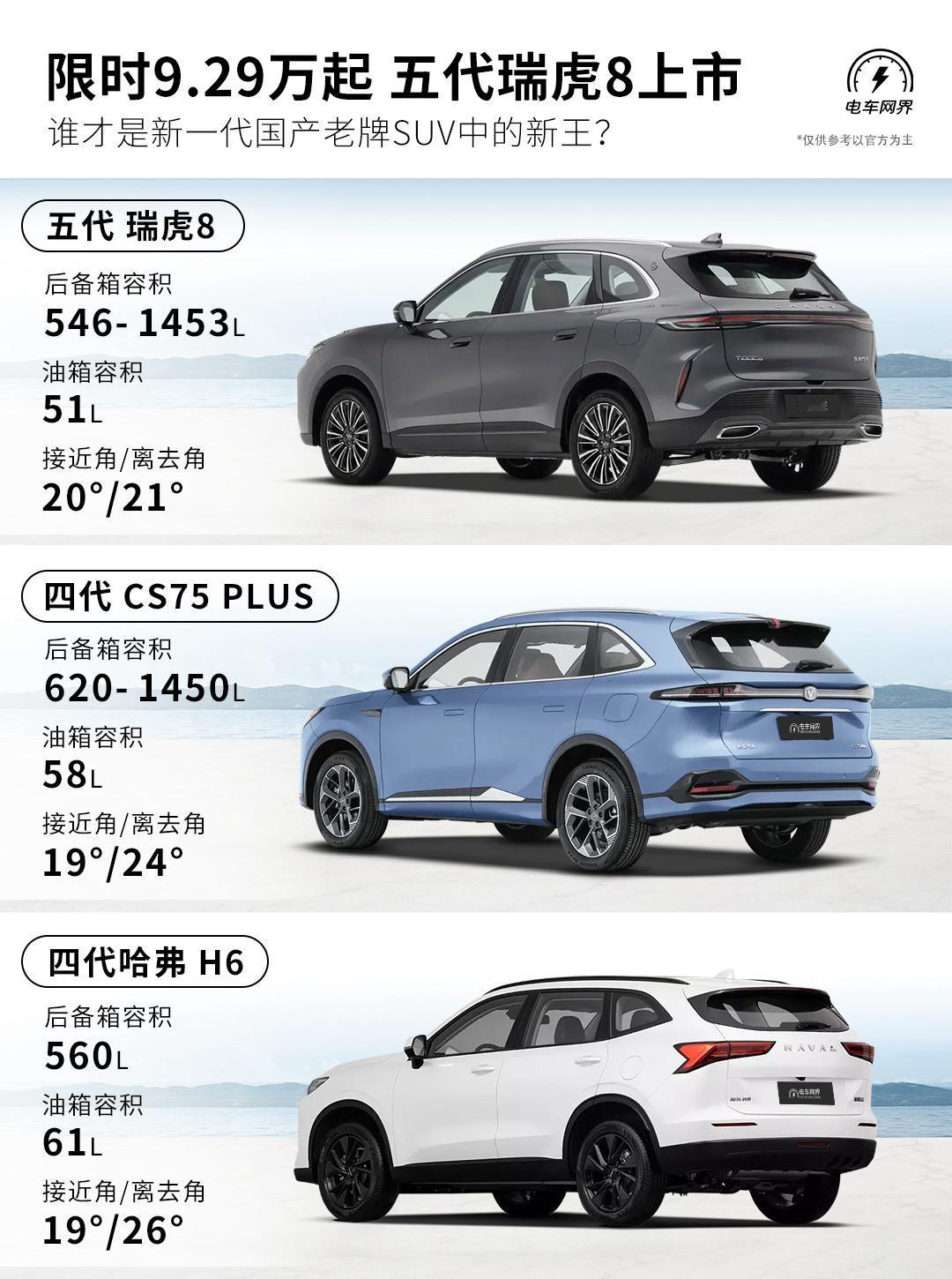第五代瑞虎8正式上市了,限时价9.29-12.29万元,另外还可享8000-12000元的置换政策(都叠加后可低至8.09万起?)。 这一代的虎8提供的2套(虎款/爆款)前脸和内饰可选,车身尺寸和轴距比老款都有所增长。动力上全系采用1.6T+7档双离合变速箱组合。 配置上全系标配方向盘四向调节、皮质座椅、540度全景影像、无钥匙进入系统及一键启动、双温区空调、二排出风口、第二排座椅靠背角度可调等配置,中高配车型增加了L2级辅助驾驶、50瓦手机无线充电、座椅加热/通风/按摩、电动尾门、可开启式全景天窗(带电动遮阳帘)等功能。 奇瑞瑞虎、长安CS75、哈弗H6……这些国产经典SUV的代表,如今已历经四五代的更迭。它们中的一员,或许是不少人人生中的第一辆车。而在电动汽车已成为主流的今天,如今的年轻人,还会继续选择它们吗?【来自懂车帝车友圈】