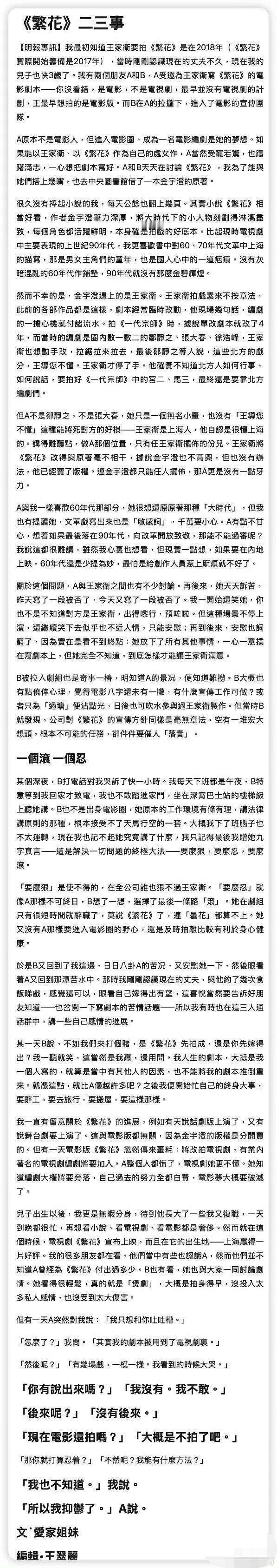 网友爆料称,繁花还有一个女编剧受害者,人家去登香港报纸诉苦…目前剧组的回应都是顾左右而言他,也否定没有用这个古二还有女编剧的创作。作为一名普通的文学爱好者,平时也写点小说,深知搞创作的不易,如果此事属实,那相关当事人可谓做得非常不道地。